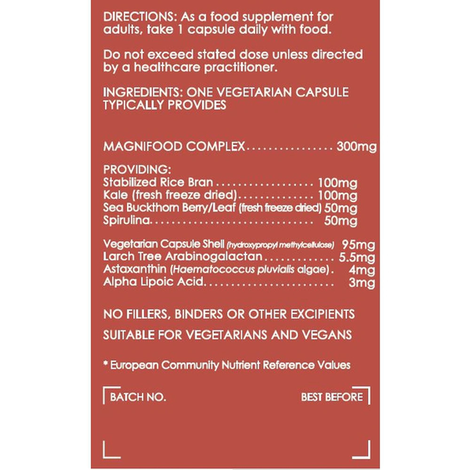 Contém magnifood complex rico em carotenóides e numerosos fitonutrientes, com poderosa sinergia com a Astaxantina e as suas ações.