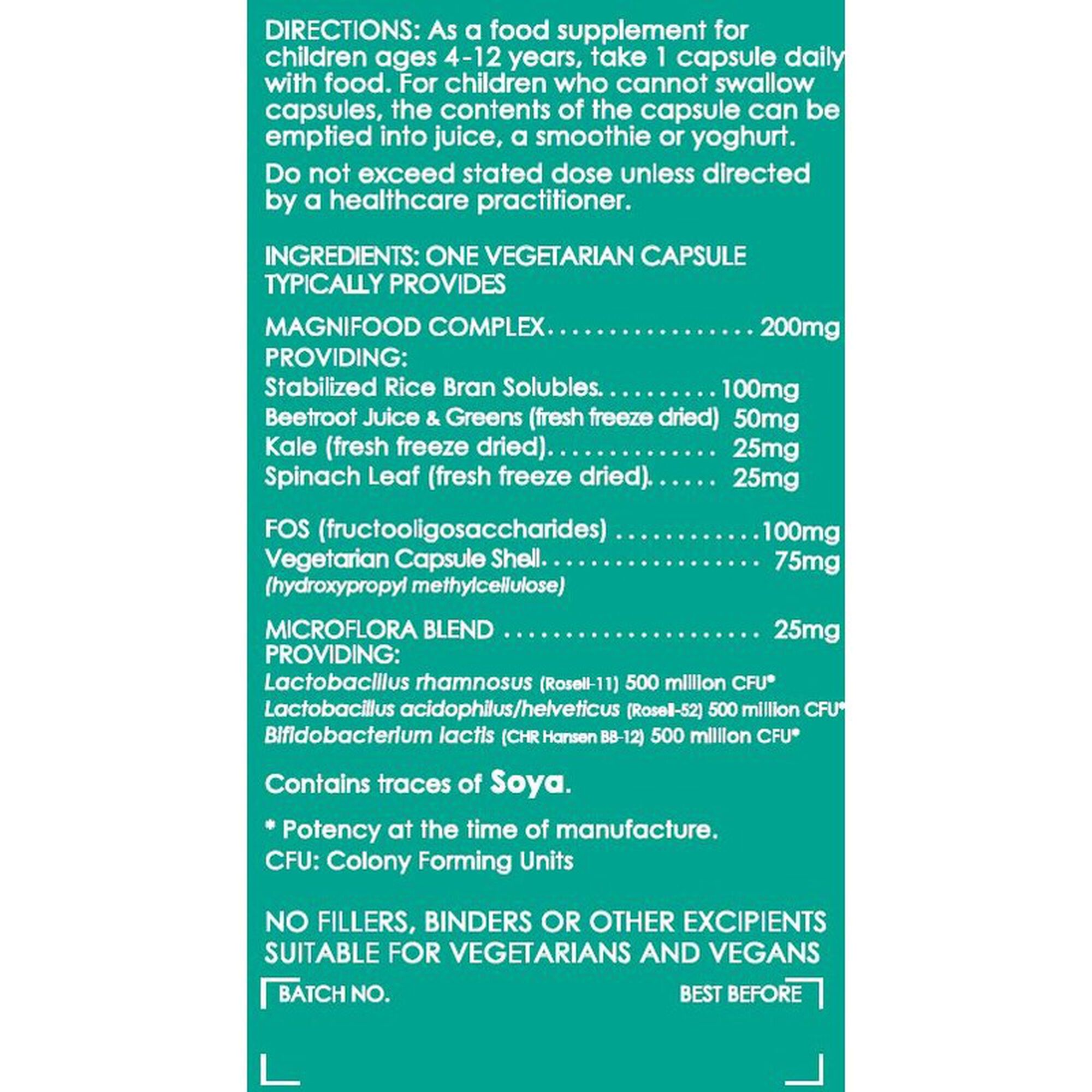 100% isenta de agentes de volume, aglomerantes ou outros aditivos e 100% adequada a vegetarianos e vegans. Uma microflora saudável ajuda a aumentar a absorção do cálcio, do ferro e do magnésio, a sintetizar vitaminas e a melhorar as defesas intestinais evitando as diarreias comuns nas crianças.