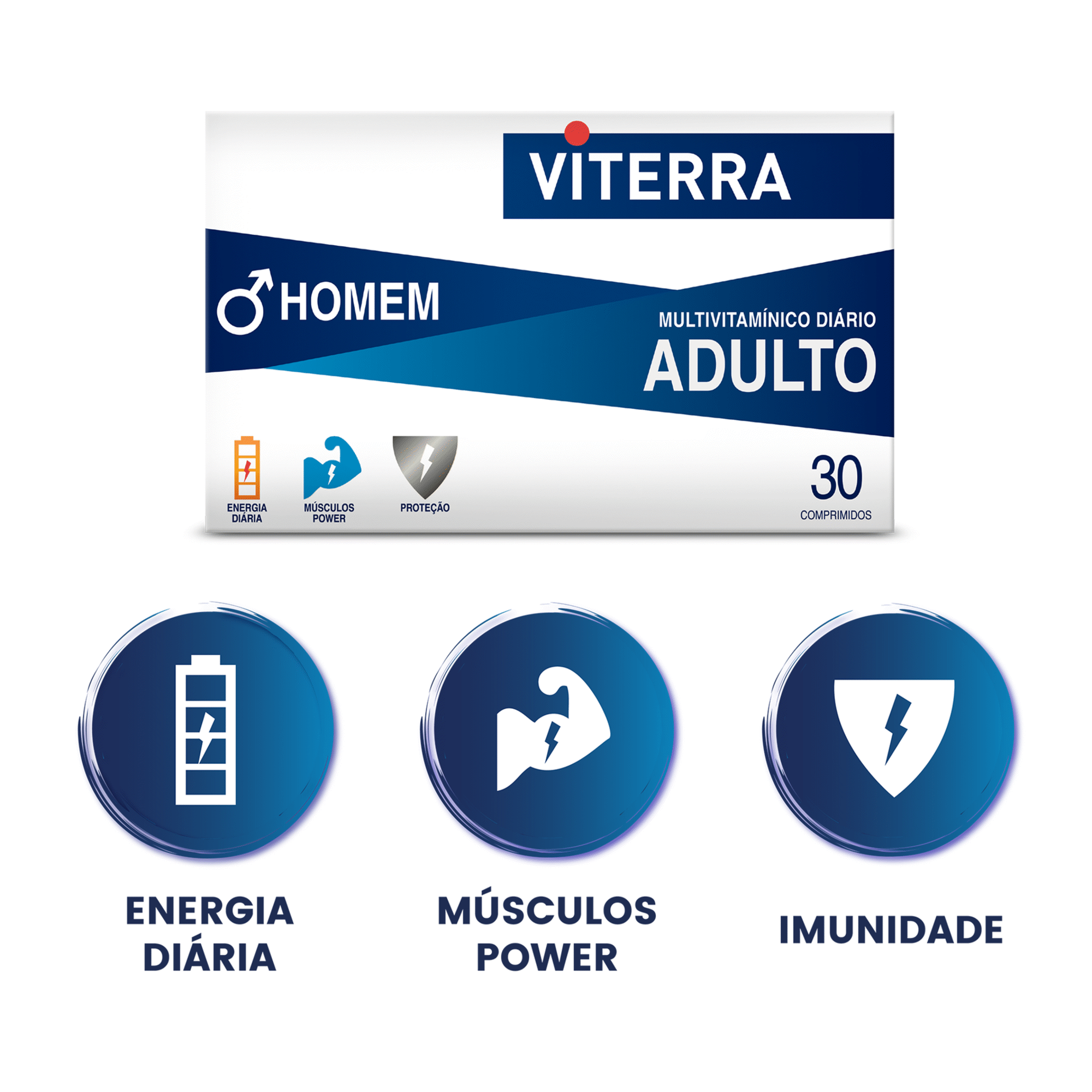 Viterra Homem Adulto, Suplemento alimentar, contém Magnésio e Vitamina D que contribuem para a manutenção do normal funcionamento muscular.
