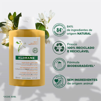 Champô destinado ao cabelo exposto ao sol, lava delicadamente eliminando os resíduos de proteção solar, sal, areia ou cloro. Nutre e protege a fibra capilar, compensando os efeitos secantes dos raios UV. O cabelo reencontra suavidade, flexibilidade e brilho. O cabelo fica sublimado e perfumado. Adequado para cabelos pintados ou com madeixas.