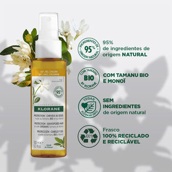 A Klorane formulou o Óleo Protetor de Tamanu Orgânico e Monoï do Taiti para cuidar do cabelo exposto ao sol. Com uma fórmula natural* que contém apenas os ingredientes essenciais, este óleo capilar protege, nutre, repara e realça o cabelo antes, durante e após a exposição.