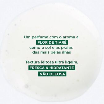 O sistema fotoprotetor patenteado e não ecotóxico tem um efeito de pele acetinada com uma textura não oleosa láctea, ultra-ligeira.