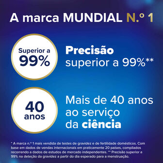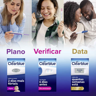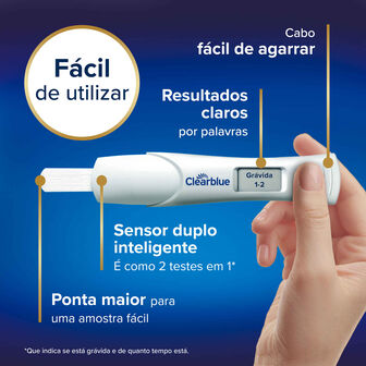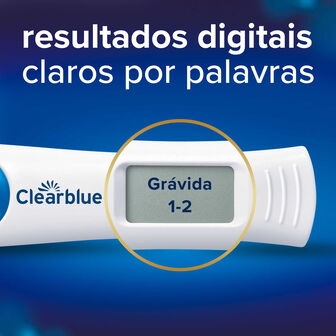 O teste de gravidez Clearblue com indicador de semanas é o primeiro e único teste tão preciso que lhe indica se está "Grávida" ou "Não Grávida" e há quanto tempo. São dois testes num, deteta a presença da hormona da gravidez com precisão, a partir do dia em que deveria aparecer o período, e também indica há quantas semanas engravidou. Dispositivo Médico.