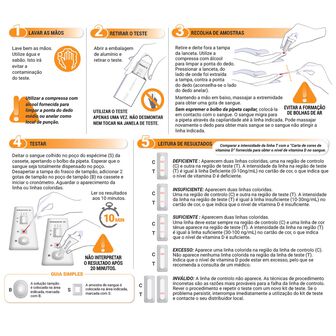 11. Aguardar o aparecimento da(s) linha(s) colorida(s). Ler os resultados aos 10 minutos. Comparar a intensidade da linha T com tabela de cor fornecida com o kit para obter o nível de vitamina D no sangue. Não interpretar o resultado após 20 minutos.