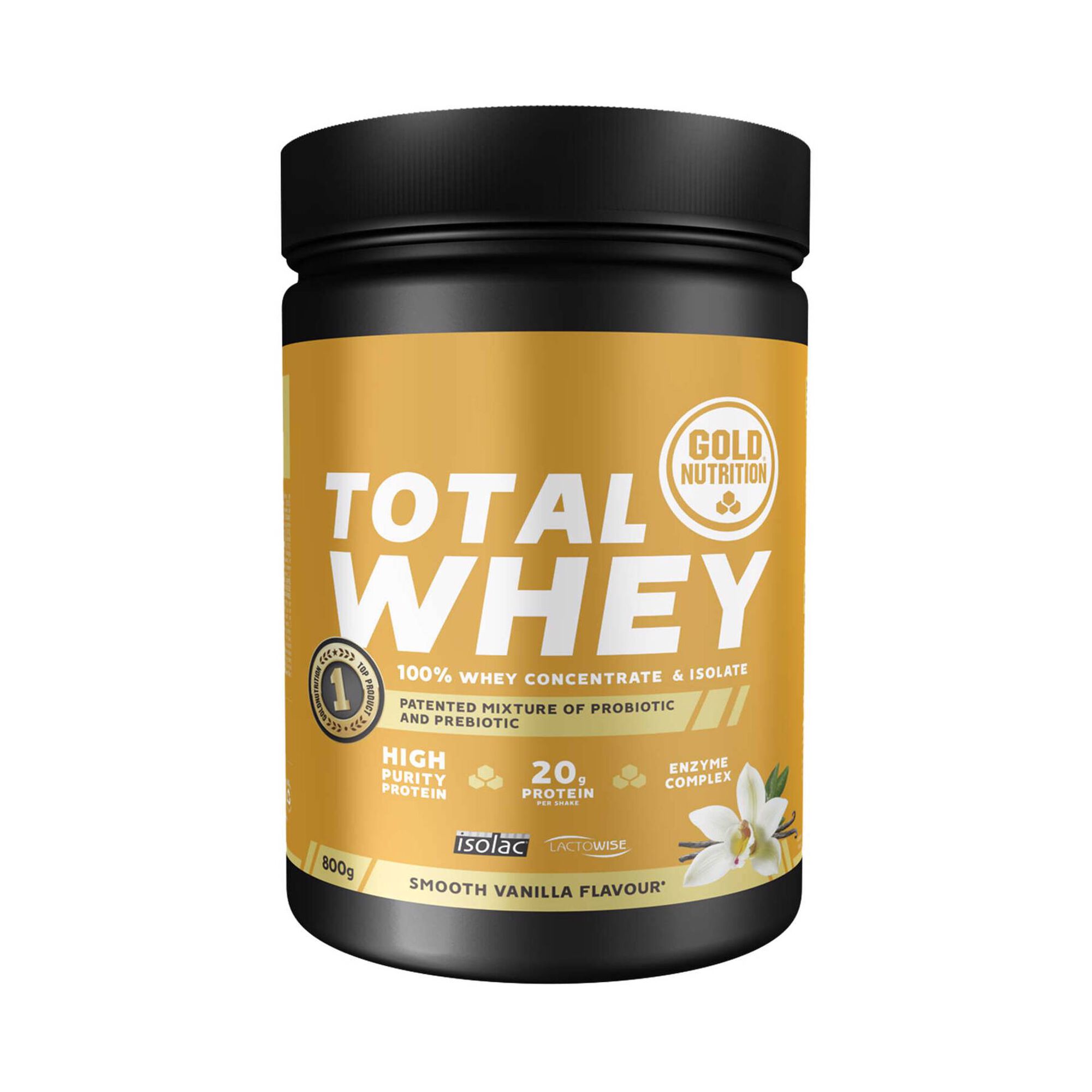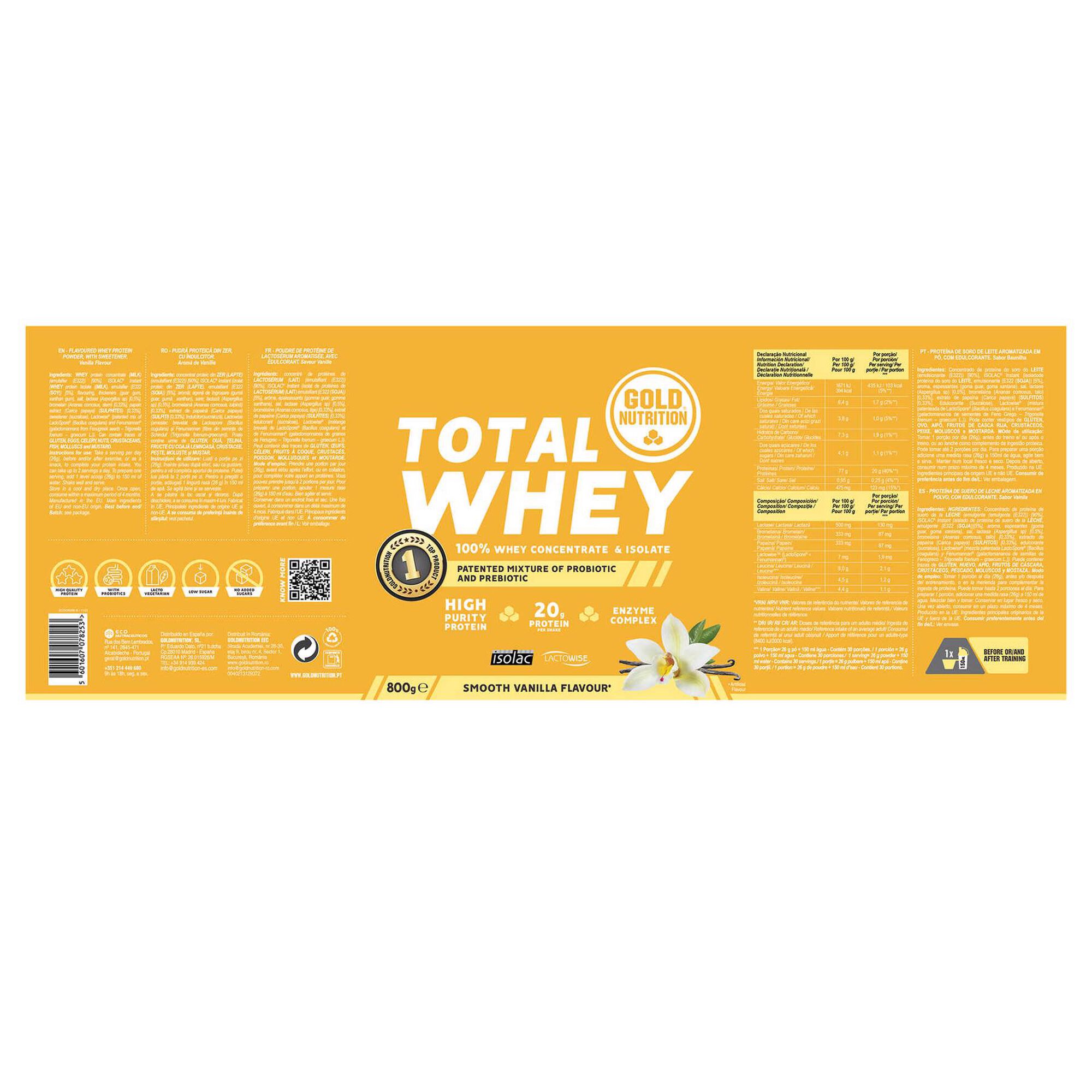A Total Whey é um suplemento em pó da GoldNutrition, composto por proteínas concentradas e isoladas do soro de leite (whey), com baixo teor em gordura e poucos hidratos de carbono. A fórmula inclui ainda um complexo de enzimas digestivas e Lactowise®, um simbiótico patenteado com ingredientes probióticos e pré-bióticos que contribui para a saúde intestinal e melhora a absorção dos nutrientes.