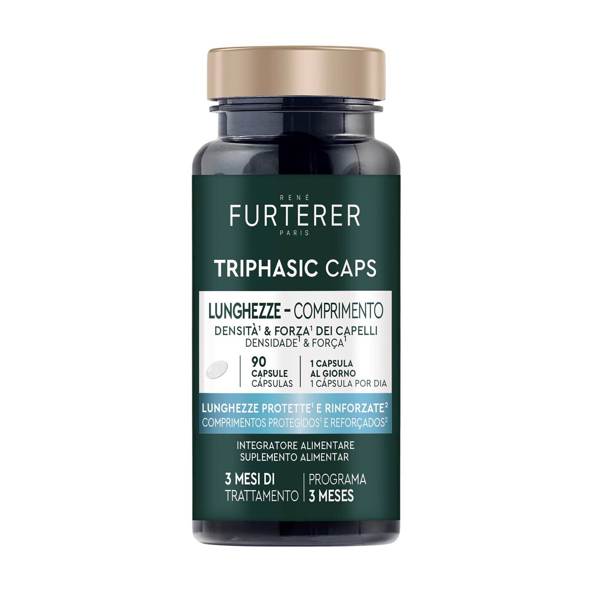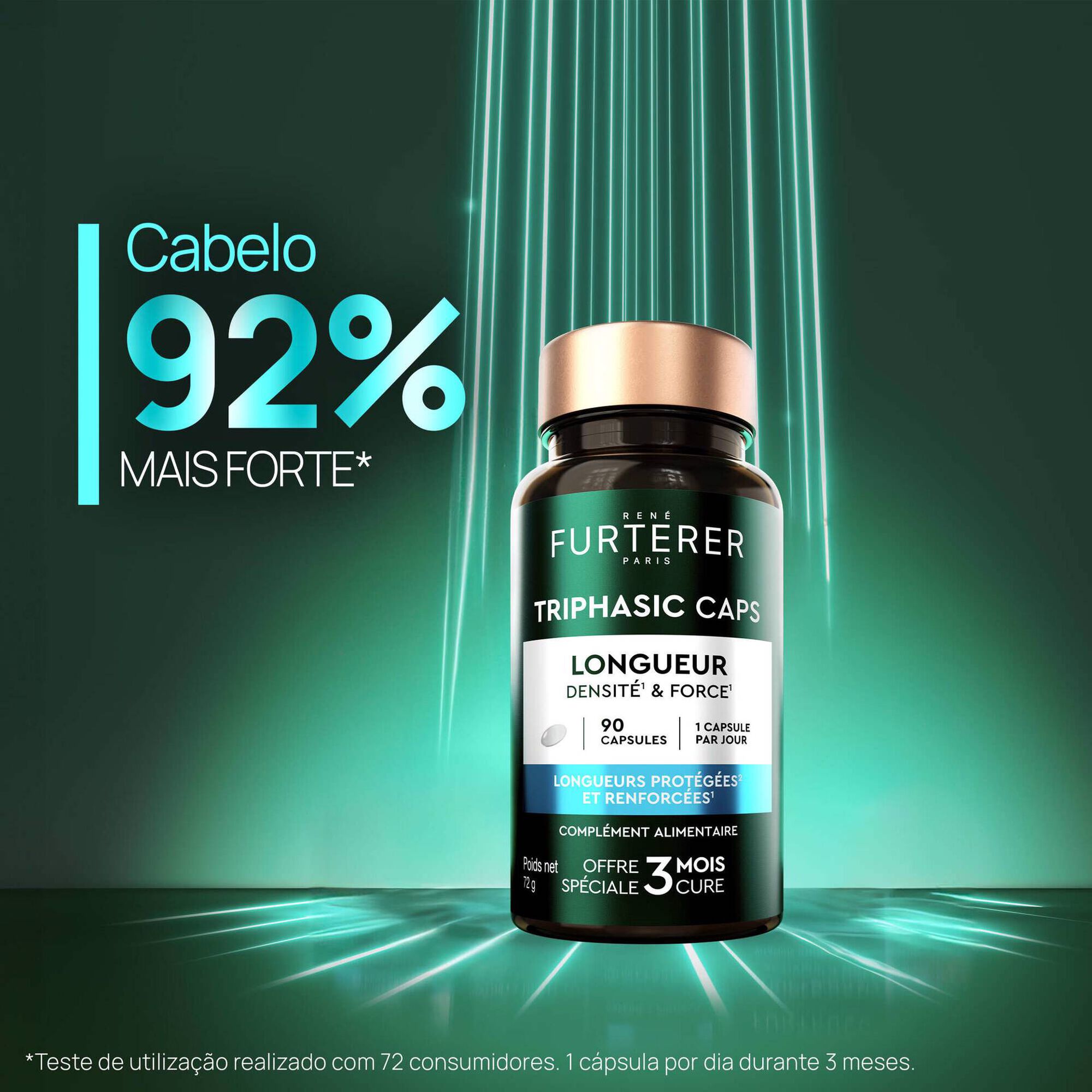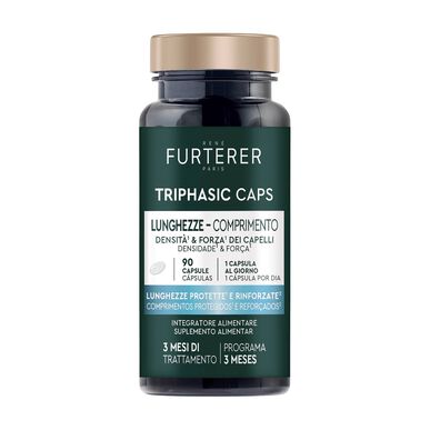 TRIPHASIC CAPS Comprimento, suplemento alimentar, especialmente concebido para cabelo comprido. A sua fórmula enriquecida com vitaminas proporciona densidade* e reforça a beleza de um cabelo comprido. Os comprimentos são reforçados* e protegidos graças à vitamina E, que ajuda na proteção celular contra o stress oxidativo. Sem colorantes artificiais.