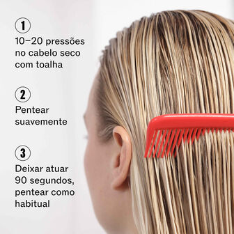 Aplicar uma pequena quantidade de produto no comprimento e pontas do cabelo limpo e previamente seco com uma toalha—não é necessário passar por água. Secar e pentear como habitualmente. Para obter os melhores resultados e conseguir um cabelo de aspeto saudável, utilizar juntamente com os Passos 1, 2 e 3 da Rotina ULTIMATE REPAIR.
