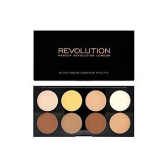 A paleta de contorno em creme Ultra Cream Contour da Makeup Revolution contém 8 produto em creme, entre eles bronzeadores e iluminadores, para definir e esculpir o rosto.
