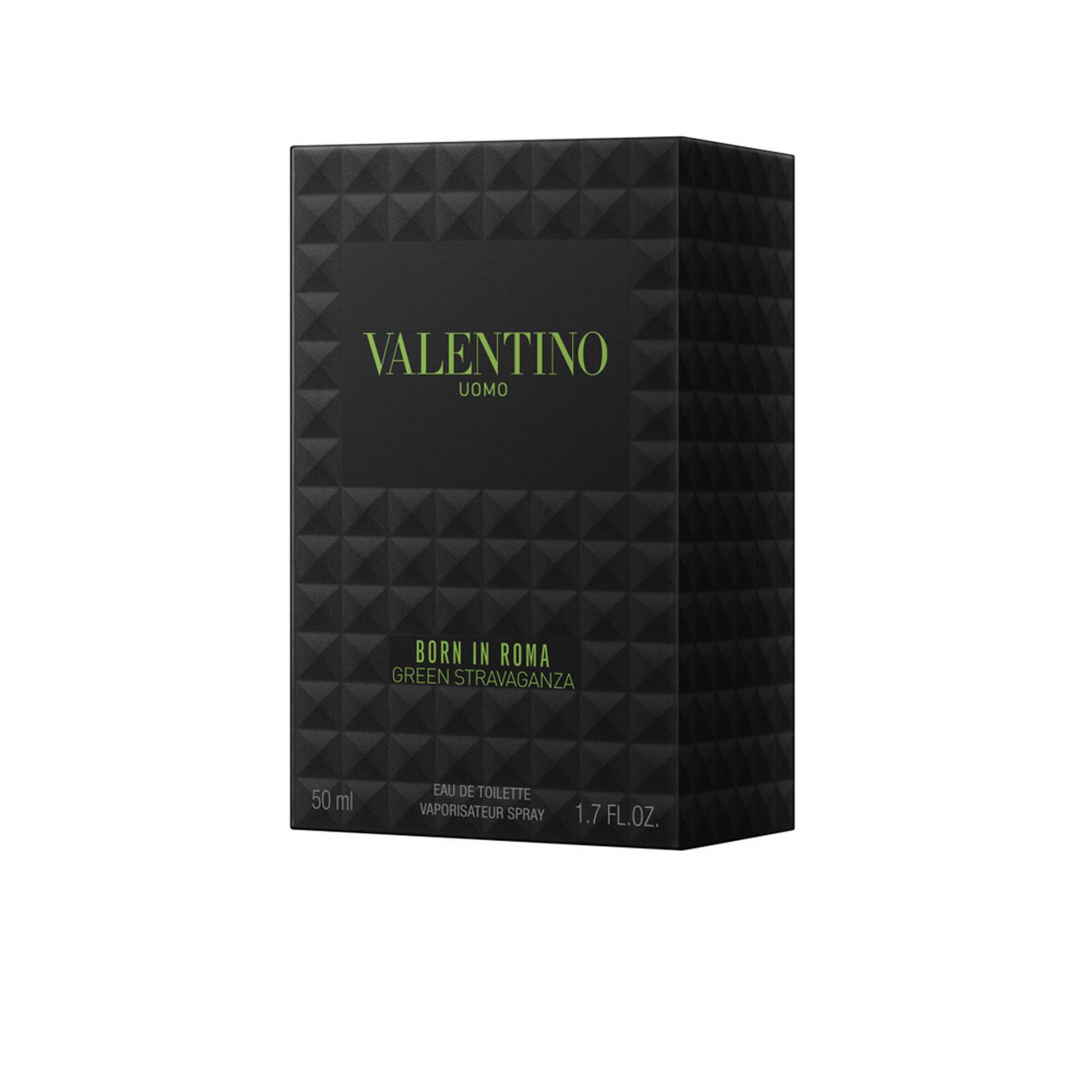 O frasco de Born in Roma Green Stravaganza representa uma homenagem ao icónico Rockstud de Valentino, com um design piramidal e vanguardista, inspirado na arquitetura romana, uma assinatura diferenciada da Maison Valentino. A modernidade do frasco contrasta com o couro vibrante em preto e verde. Para Valentino, o verde é ousado e excessivo, apaixonante e extravagante, assim como quem o utiliza.