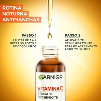 Garnier sérum de noite antimanchas com 10% de vitamina C pura e ácido hialurónico. Consegue uma pele visivelmente mais suave, flexível, revitalizada e descansada após a primeira utilização. Diz adeus às manchas, à pele apagada e às linhas finas.