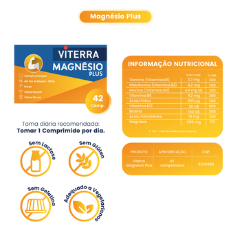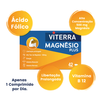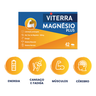 Viterra Magnésio Plus contribui para a redução do cansaço e da fadiga, para o normal funcionamento muscular e para um sistema nervoso normal. Suplemento alimentar.