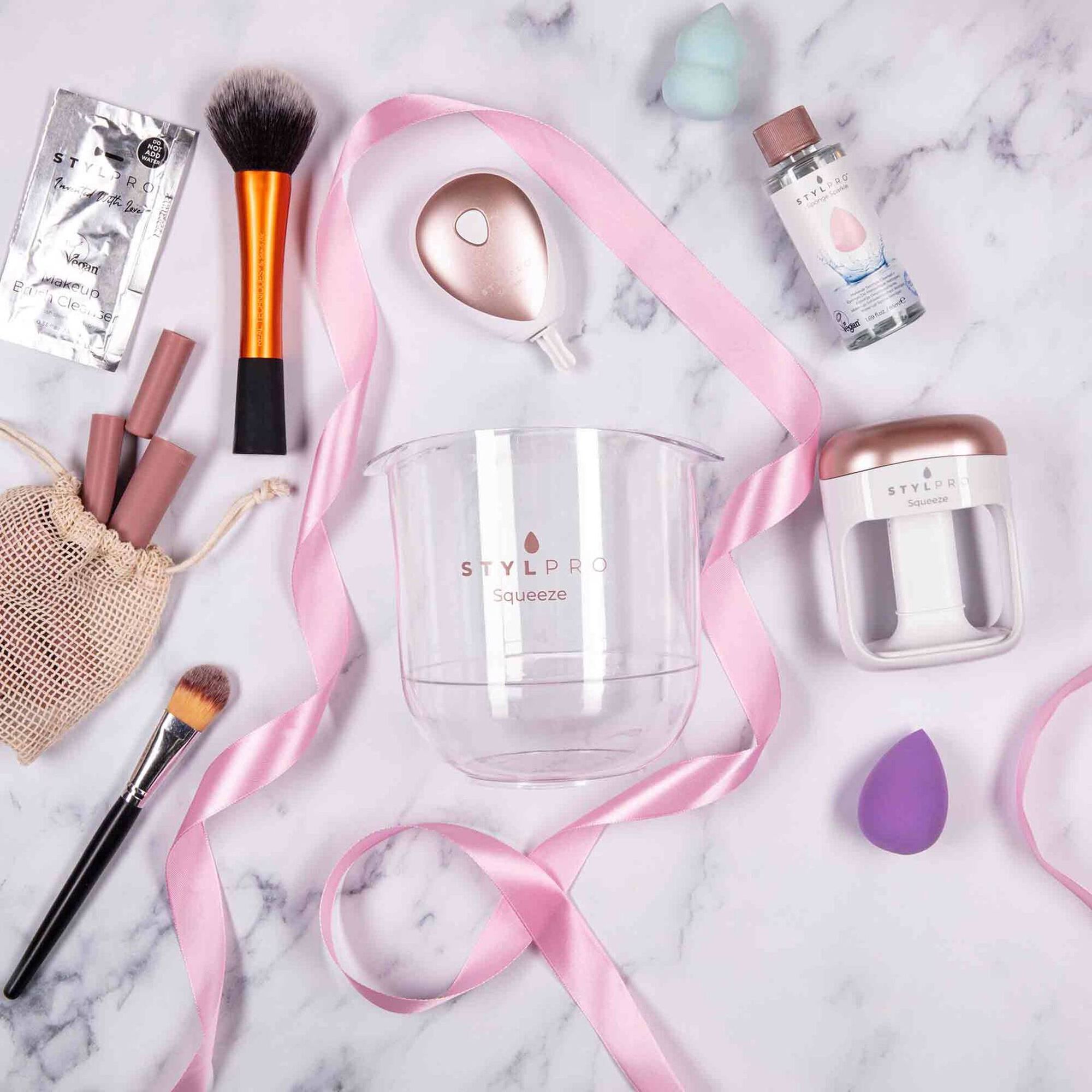 O Conjunto de Remoção de Maquilhagem para Pincéis e Esponjas pin & Squeeze 2 em 1 deixa como novos os pincéis e esponjas de maquilhagem.