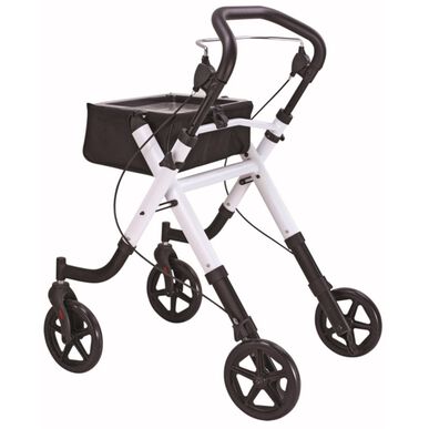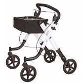 As rodas traseiras são travadas a partir da alça e este tem uma estrutura em alumínio com uma cesta transparente e saco removível e não precisa de levantar o andarilho para avançar graças às suas rodas de 20 cm.