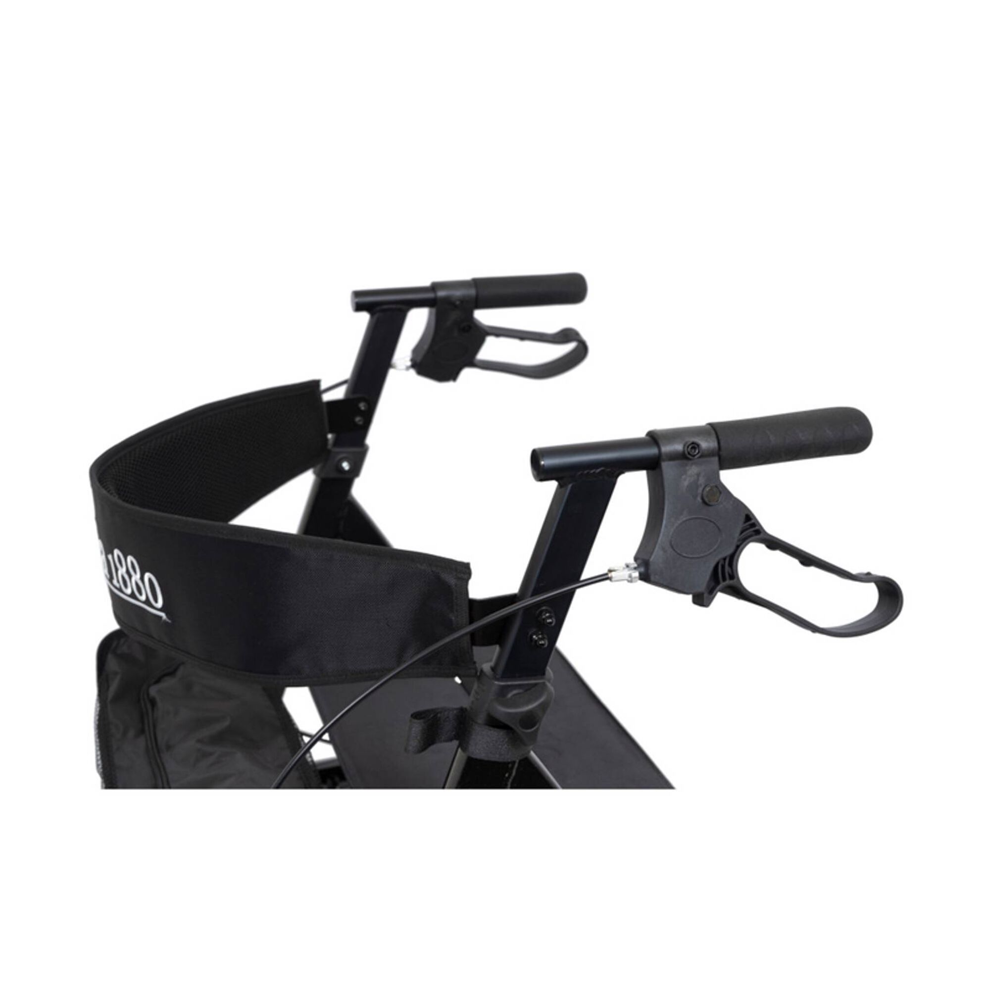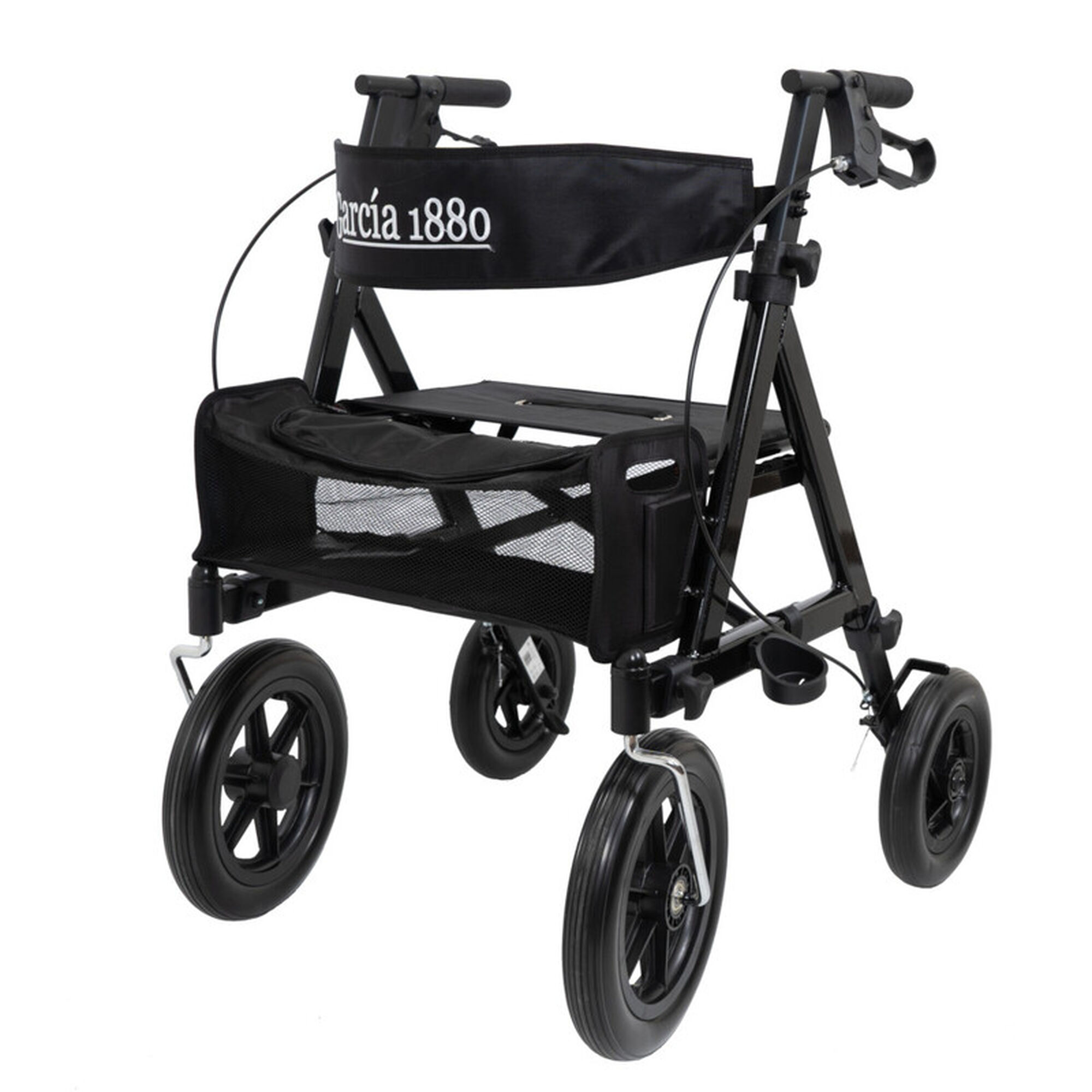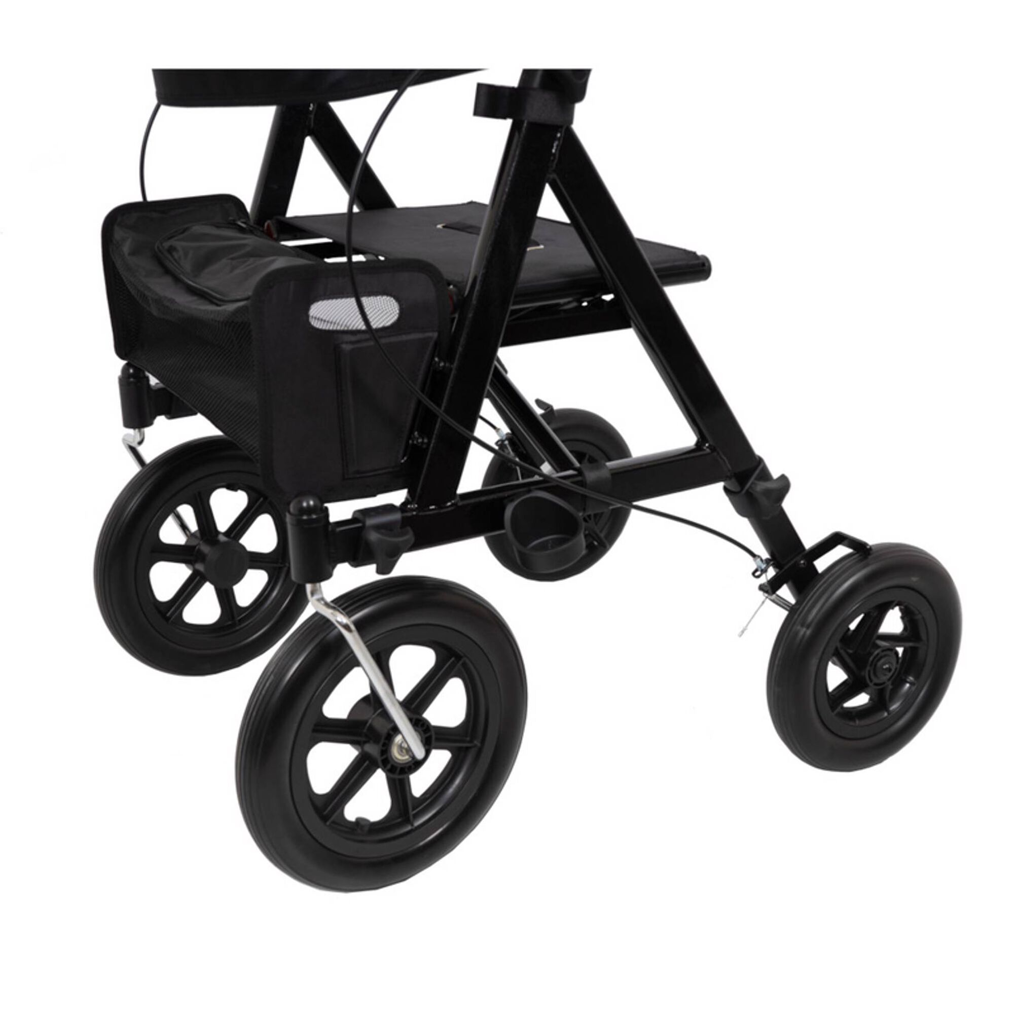 O Andarilho Rolante Rodas Todo-o-Terreno tem travões operados por manopla e bloqueio reduz o esforço ao caminhar.