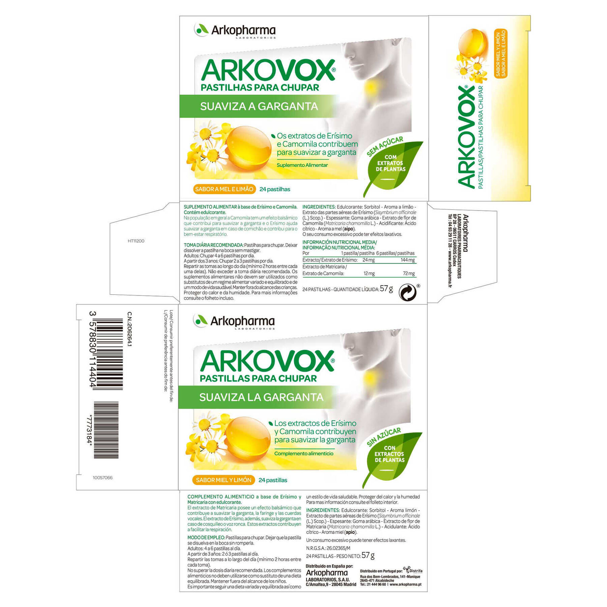 Arkobox sabor a mel e limão é feito à base de Erísimo e Camomila. Contém edulcorante. A Camomila tem um efeito balsâmico que contribui para suavizar a garganta. O erísimo ajuda a suavizar a garganta em caso de comichão e contribui para o bem-estar respiratório. Suplemento alimentar.