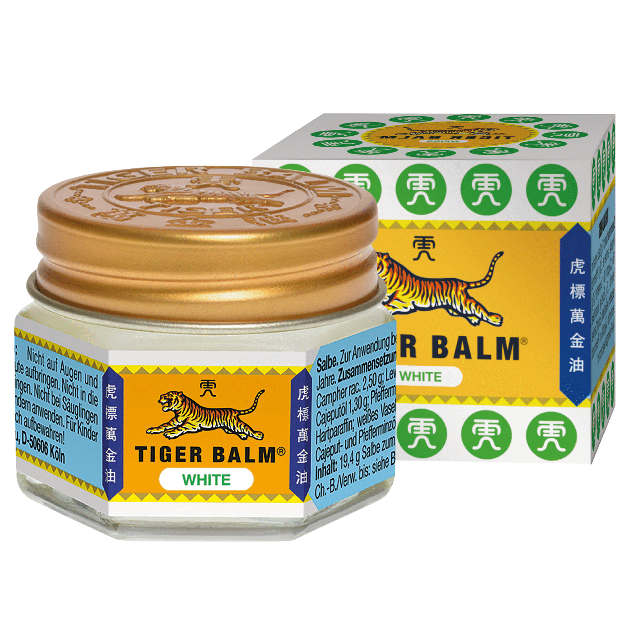 O Tiger Balm - Branco é um bálsamo aromático de massagem à base de plantas.