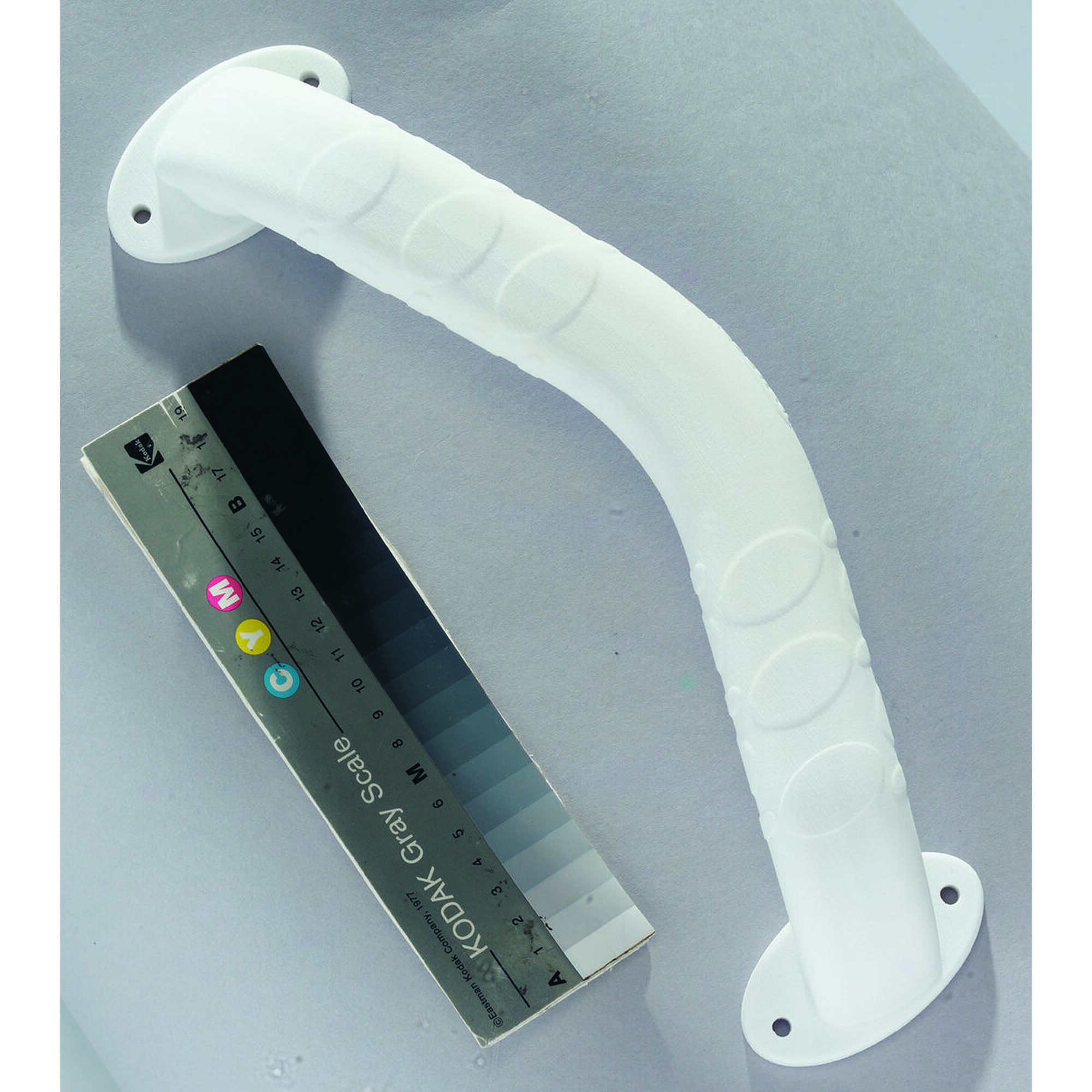 Fixação com parafusos (não incluídos). Adaptável a qualquer tipo de superficie. Oferece 2 alturas de apoio. Forma oval. Para apoio na saída do banho ou da sanita.