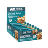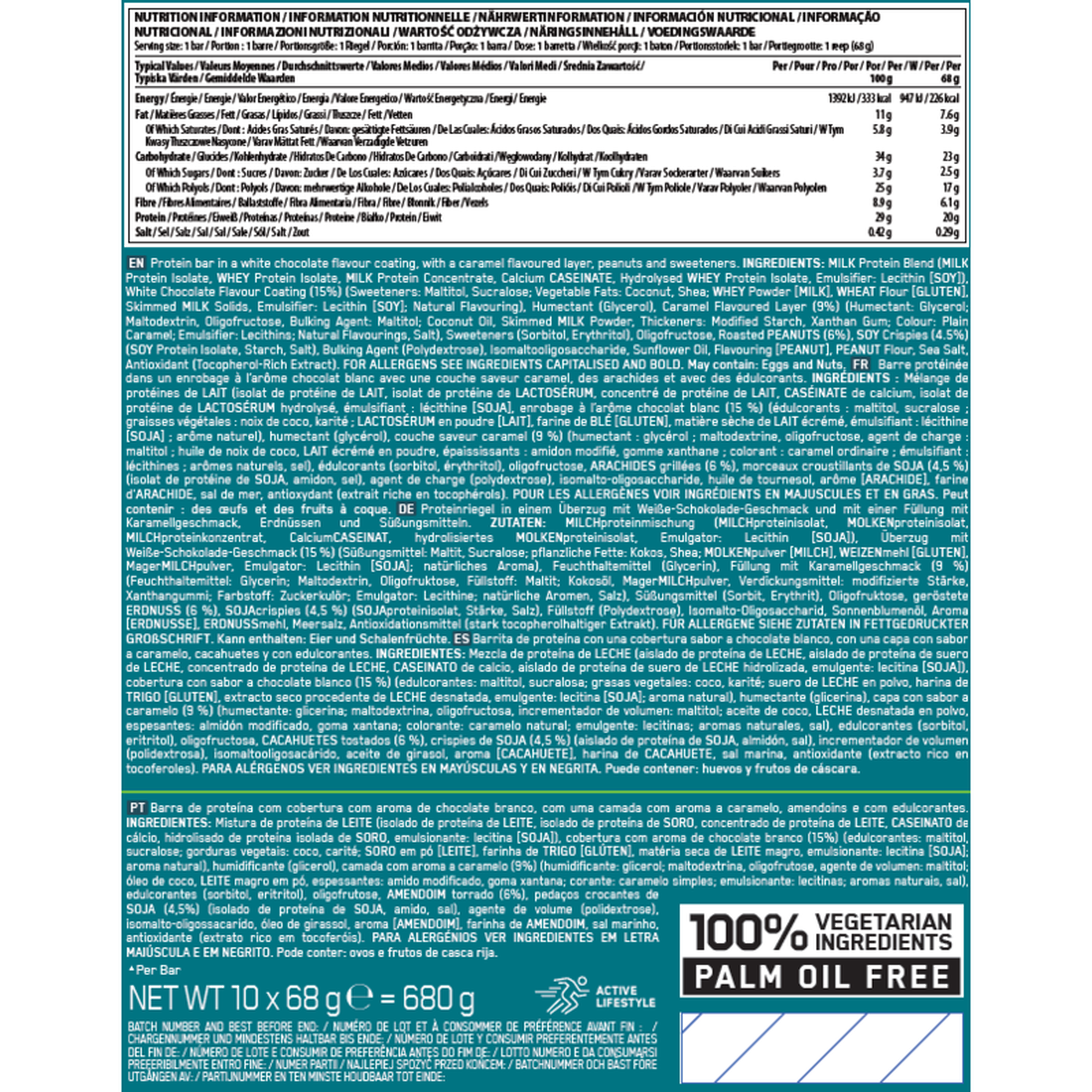 Mistura de proteínas do LEITE (Isolado de proteínas do LEITE, Isolado de proteínas do TRIGO, Concentrado de proteínas do LEITE, CASEINATO de cálcio, Isolado de proteínas do TRIGO hidrolisado, Emulsionante: Lecitina [SOJA]), cobertura com sabor a chocolate branco (15%) (edulcorantes: Maltitol, Sucralose; Gorduras vegetais: coco, karité; TRIGO em pó [LEITE], farinha de TRIGO [GLÚTEN], sólidos de LEITE desnatado, emulsionante: Lecitina [SOJA]; Aroma natural), Humectante (Glicerol), Camada com sabor a caramelo (9%) (Humectante: Glicerol; Maltodextrina, Oligofrutose, Agente de volume: Maltitol; óleo de coco, leite em pó desnatado, espessantes: Amido modificado, goma xantana; Cor: Caramelo simples; Emulsionante: Lecitinas; Aromas naturais, Sal), Edulcorantes (Sorbitol, Eritritol), Oligofrutose, AMENDOINS torrados (6%), Crispies de SOJA (4,5%) (Isolado proteico de SOJA, Amido, Sal), Agente de volume (Polidextrose), Isomaltooligossacarídeo, Óleo de girassol, Aromatizante [AMENDOIM], Farinha de AMENDOIM, Sal marinho, Antioxidante (Extrato rico em tocoferol).