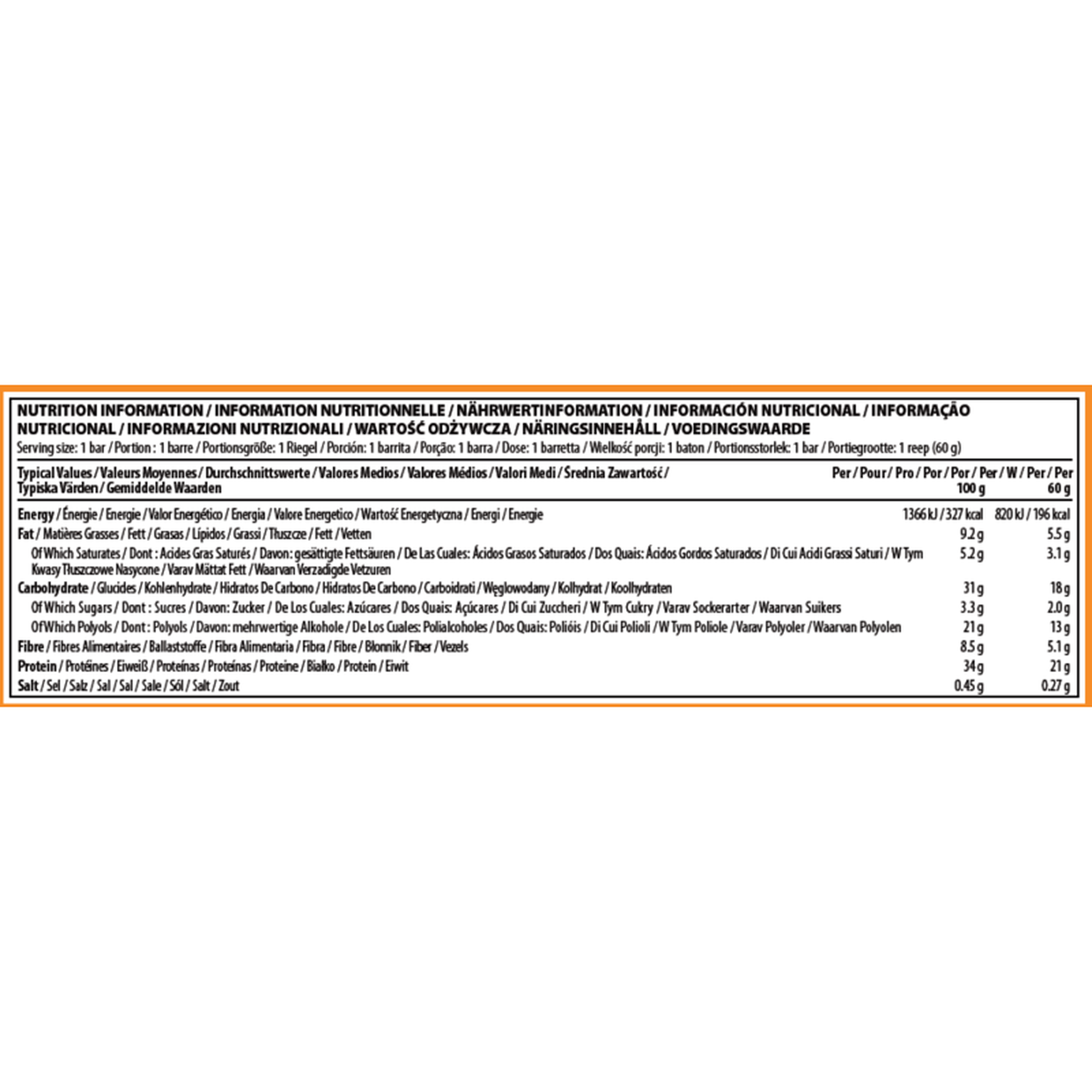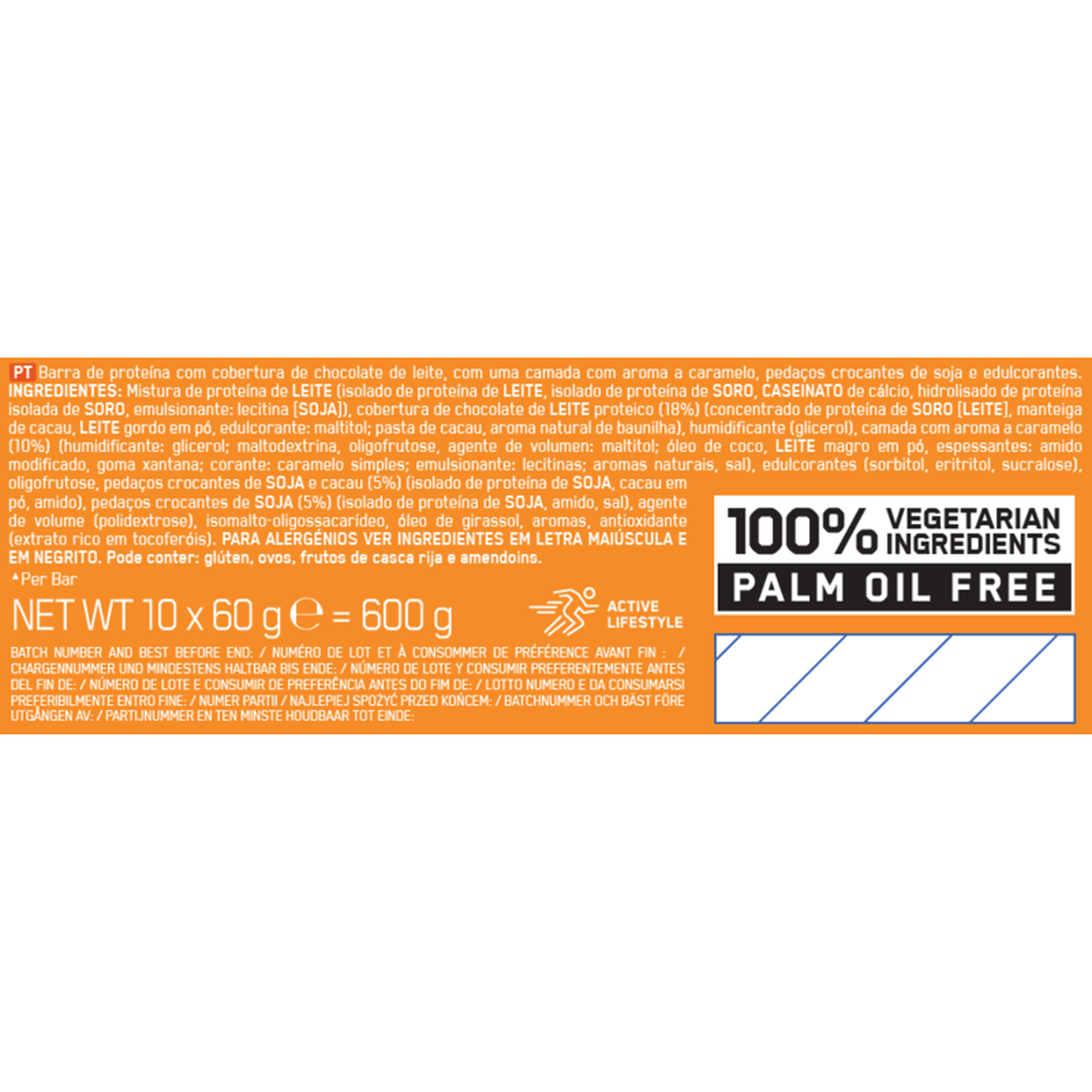Mistura de proteínas do LEITE (Isolado de proteínas do LEITE, Isolado de proteínas do TRIGO, CASEINATO DE CÁLCIO, Isolado de proteínas do TRIGO hidrolisado, Emulsionante: Lecitina [SOJA]), Cobertura proteica de chocolate de LEITE (18%) (Concentrado de proteína de LEITE [LEITE], manteiga de cacau, LEITE gordo em pó, adoçante: Maltitol; Massa de cacau, Aroma natural de baunilha), Humectante (Glicerol), Camada com sabor a caramelo (10%) (Humectante: Glicerol; Maltodextrina, Oligofrutose, Agente de volume: Maltitol; óleo de coco, leite em pó desnatado, espessantes: Amido modificado, goma xantana; Cor: Caramelo simples; Emulsionante: Lecitinas; Aromas naturais, sal), edulcorantes (sorbitol, eritritol, sucralose), oligofrutose, crocantes de cacau de SOJA (5%) (isolado proteico de SOJA, cacau em pó, amido), crocantes de SOJA (5%) (isolado proteico de SOJA, amido, sal), agente de volume (polidextrose), isomaltooligossacárido, óleo de girassol, aromas, antioxidante (extrato rico em tocoferol).
