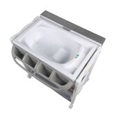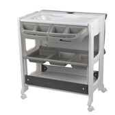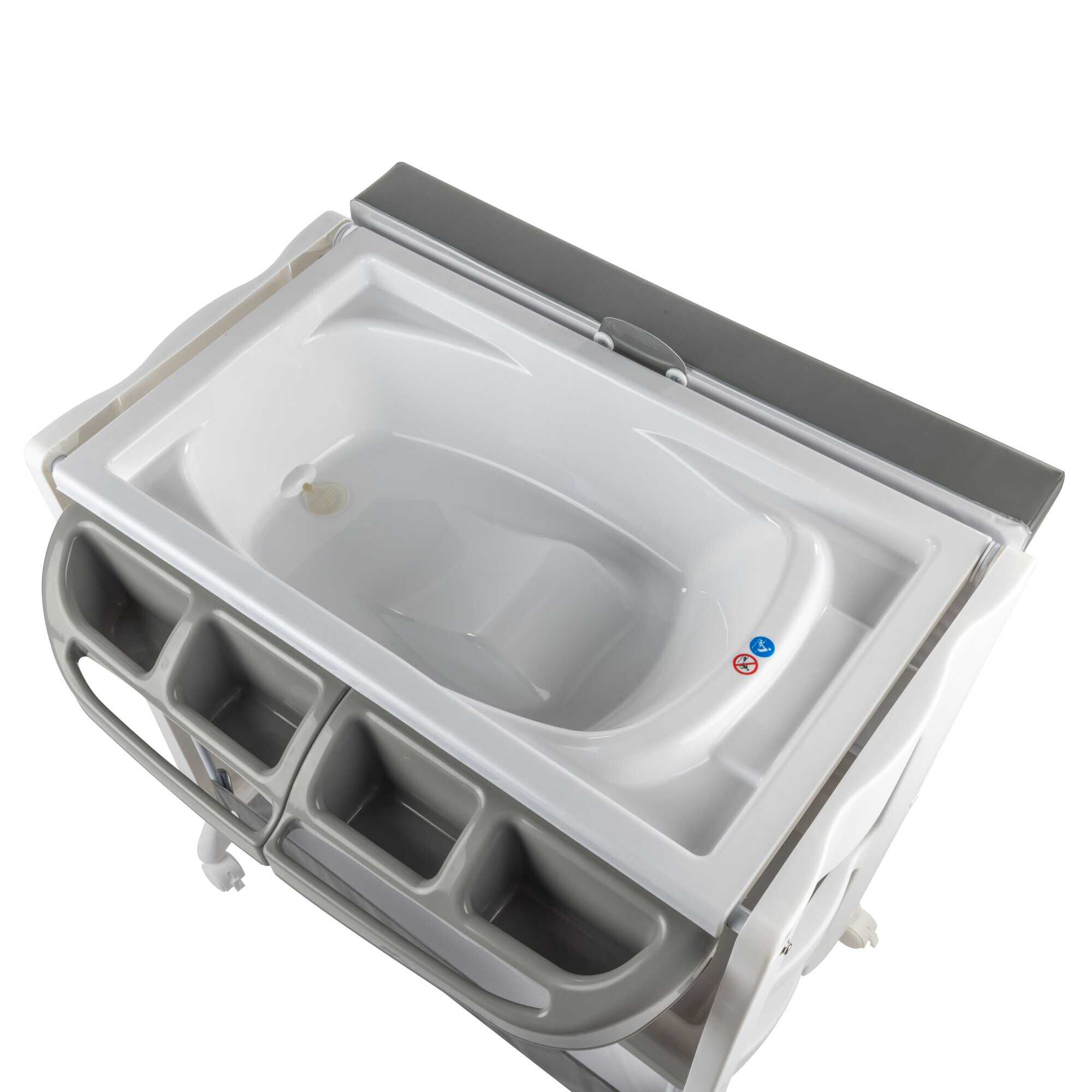 A Dolphy também é muito prática graças aos vários compartimentos de armazenamento e toalheiros. Os pais podem trocar o bebé e dar-lhe banho em qualquer parte da casa, graças às 4 rodas com trava, que tornam a Dolphy fácil de mover.