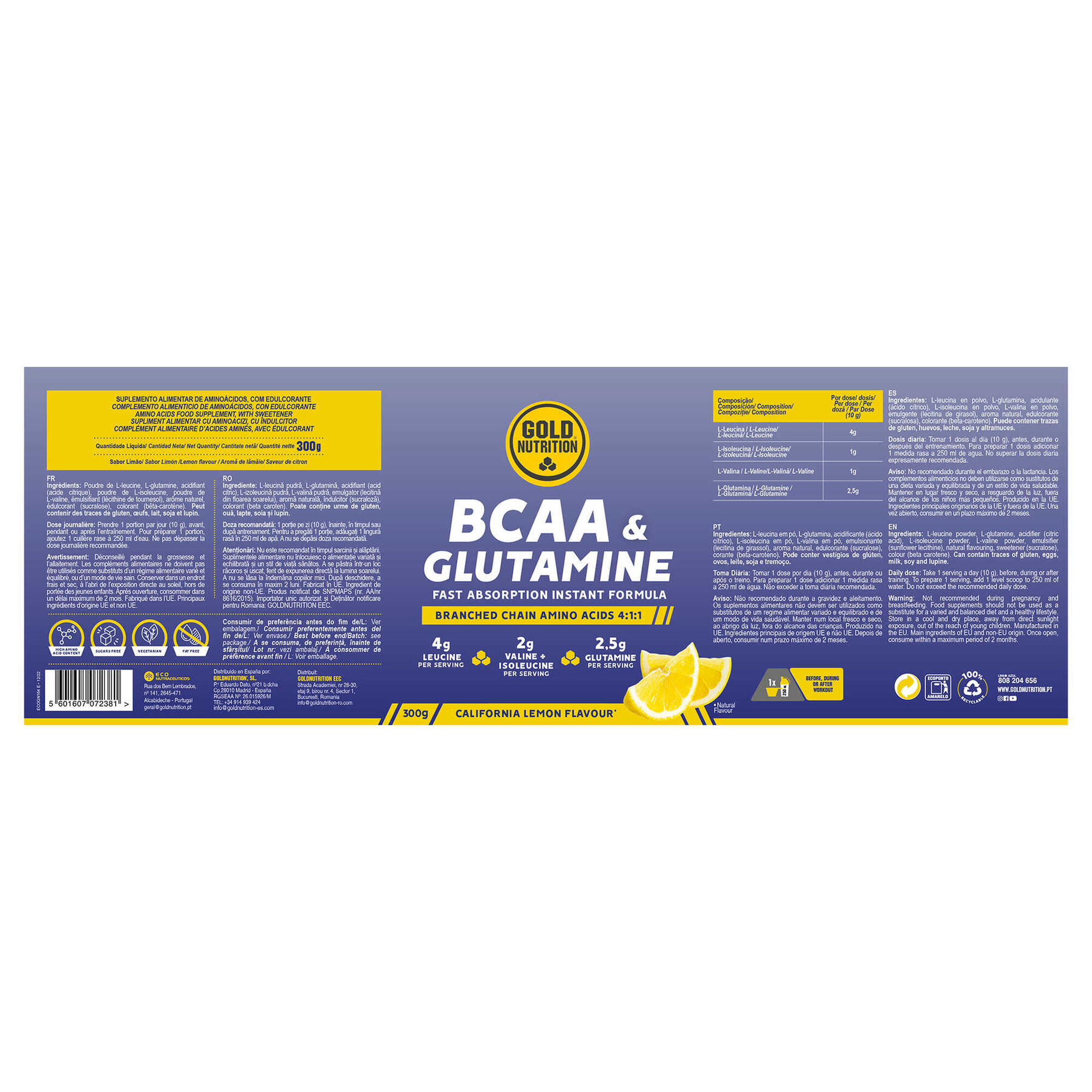 A conjugação entre os BCAA e a Glutamina permitem obter uma fórmula que potencia a síntese proteica, promove uma melhor recuperação muscular após o exercício e previne a fadiga crónica. Cada dose fornece 5 g de creatina Creapure. A sua toma deve ser combinada com açúcares ou proteínas estimulantes da produção de insulina como a proteína whey. Suplemento alimentar.