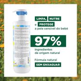 Nova fórmula natural: com Calêndula calmante proveniente de flores de produção biológica. A sua fórmula com 98% de ingredientes de origem natural, de perfume gentil e relaxante, limpa com suavidade e protege a pele da secura cutânea.