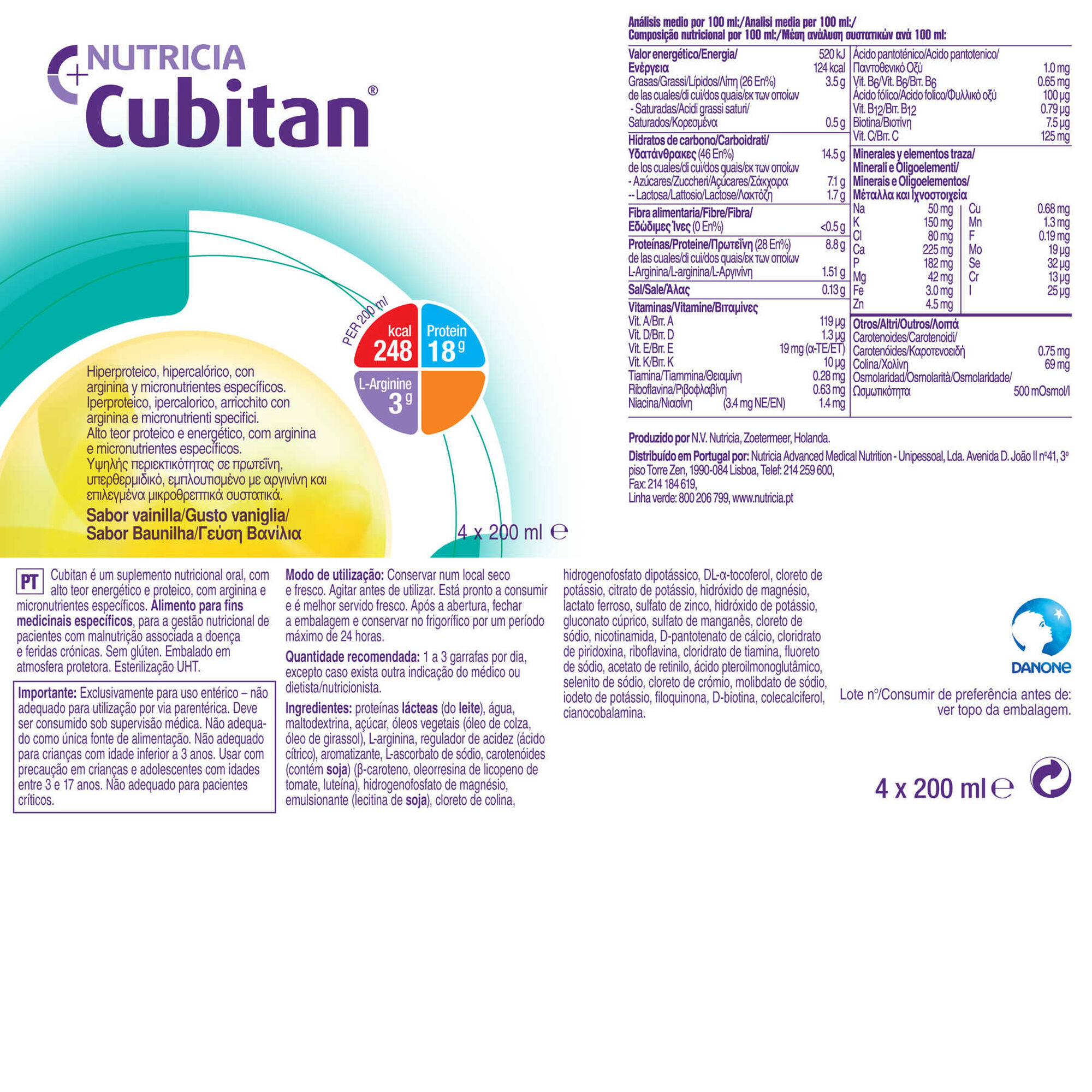 Suplemento alimentar nutricional oral hiperproteico e hipercalórico líquido, enriquecido em arginina e micronutrientes (zinco, ferro, selénio, Vit.A, Vit.C e Vit.E). Isento de glúten.