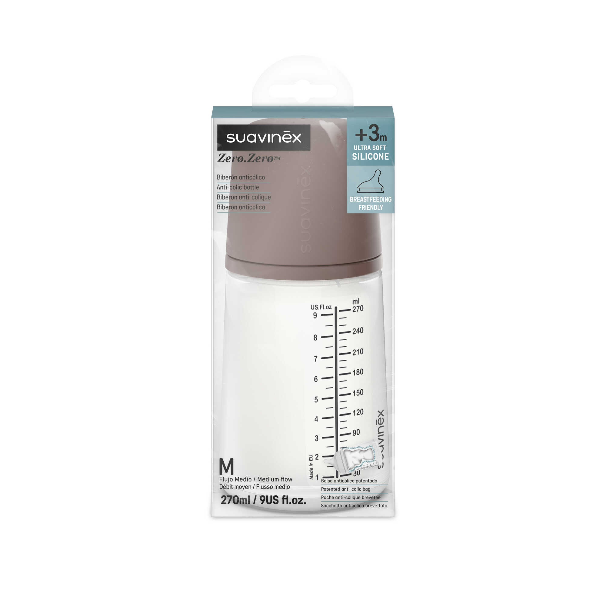 O sistema deste inovador biberão faz com que as borbulhas desapareçam para evitar a ingestão de ar, ajudando a reduzir as cólicas gasosas do bebé. O biberão zero-zero Suavinex imita física e fisiologicamente o mamilo da mãe, evitando a confusão.