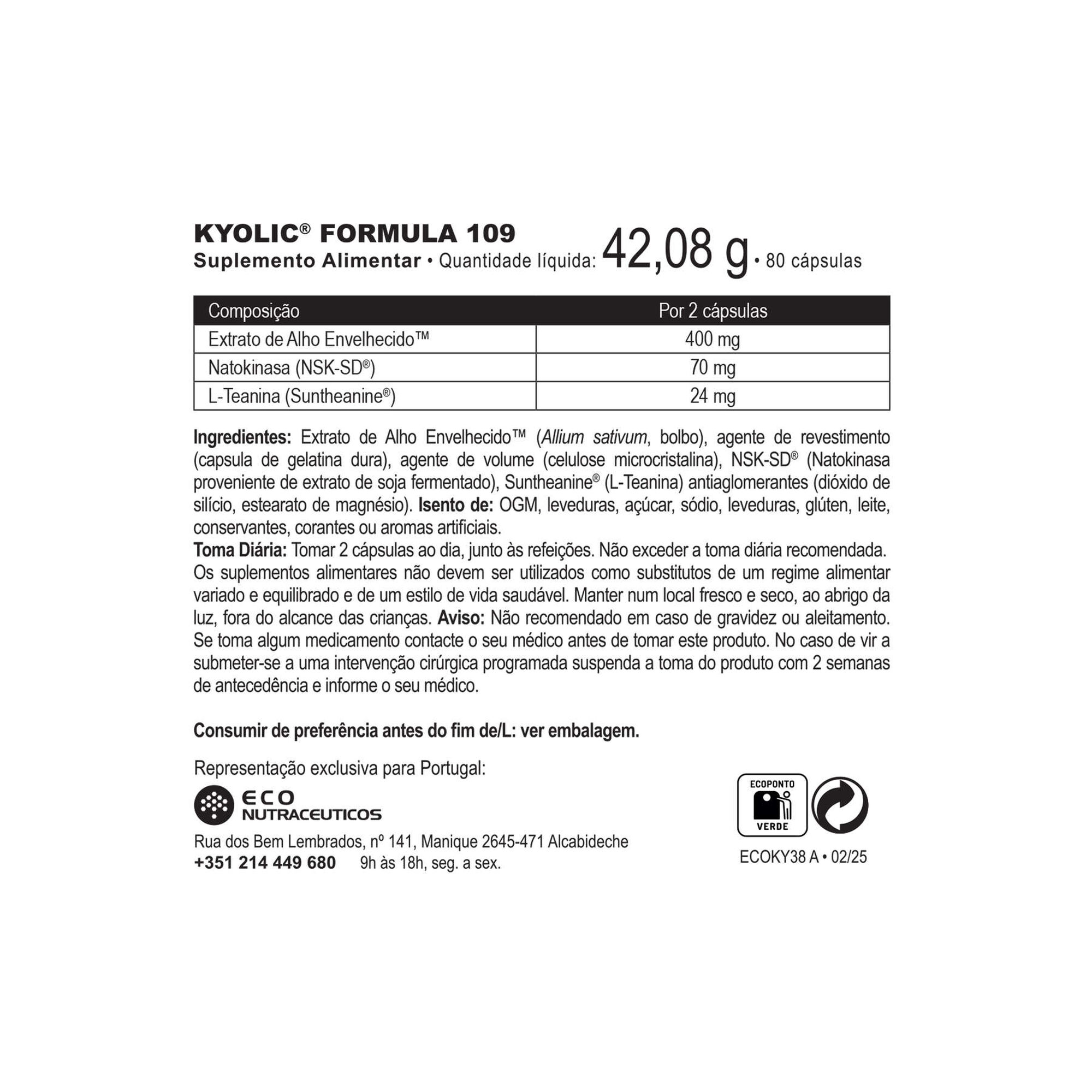 Kyolic Aged Garlic Extract™ (AGE) Fórmula 109 é um suplemento alimentar premium, desenvolvido para apoiar de forma natural a saúde cardiovascular. Cada porção (2 cápsulas) combina 400 mg de Extracto de Alho Envelhecido™ (AGE), conhecido pelas suas propriedades antioxidantes e de suporte à circulação, com 70 mg de Nattokinase (NSK-SD®), uma enzima natural que promove a fluidez do sangue, e 24 mg de L-Teanina (Suntheanine®), um aminoácido que ajuda a reduzir o stress, contribuindo para o bem-estar geral.