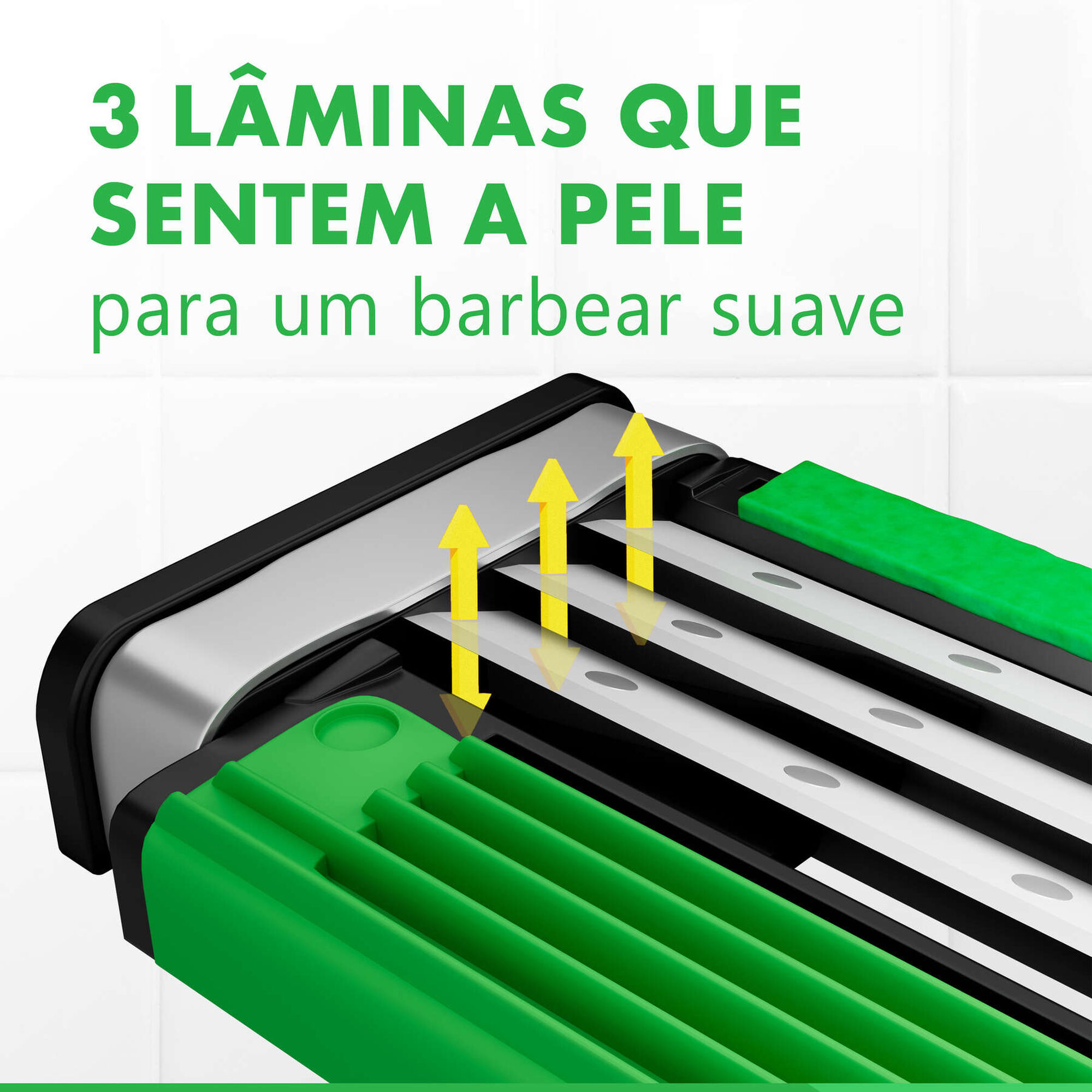 A máquina de barbear descartável Blue3 Sensitive da Gillette inclui 3 lâminas revestidas a crómio que deslizam facilmente pela pele e uma cabeça rotativa a 40° que se ajusta aos contornos do rosto.