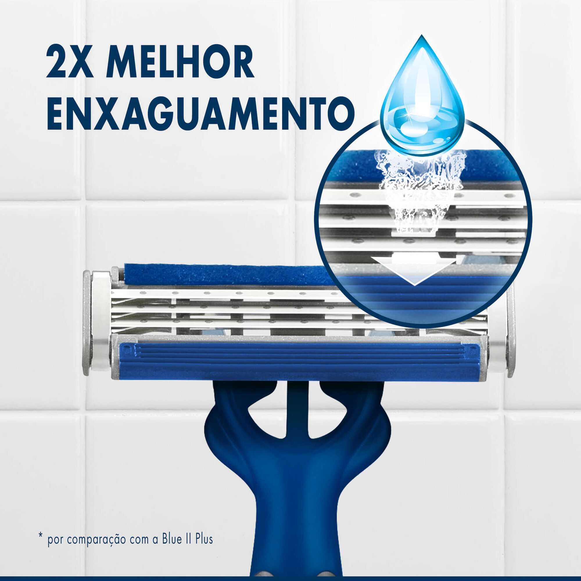 A máquina de barbear inclui uma pega de manuseamento fácil para excelente controlo e lâminas simples de enxaguar para um enxaguamento 2x melhor (vs. BlueII Plus).
