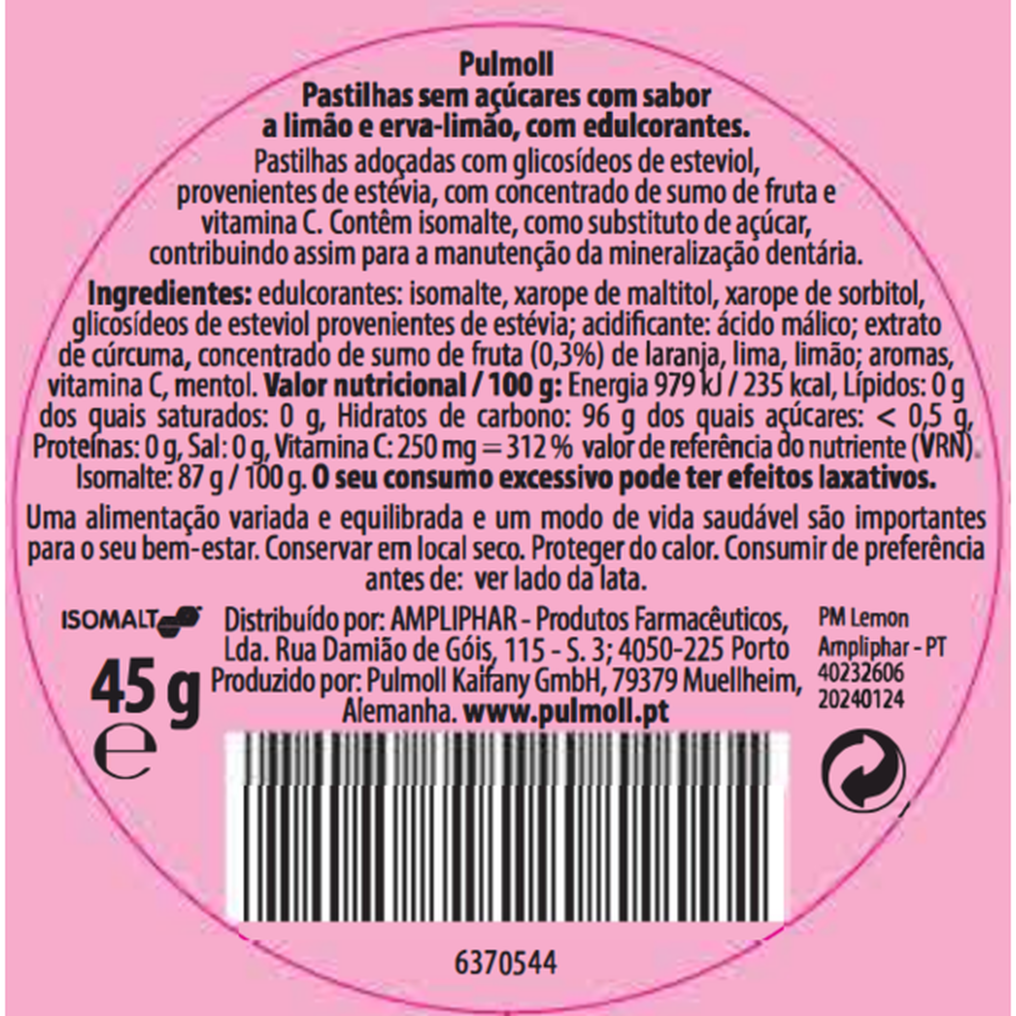 Aroma de limão e erva-limão, com vitamina C, edulcorantes, Stevia e Isomalte.