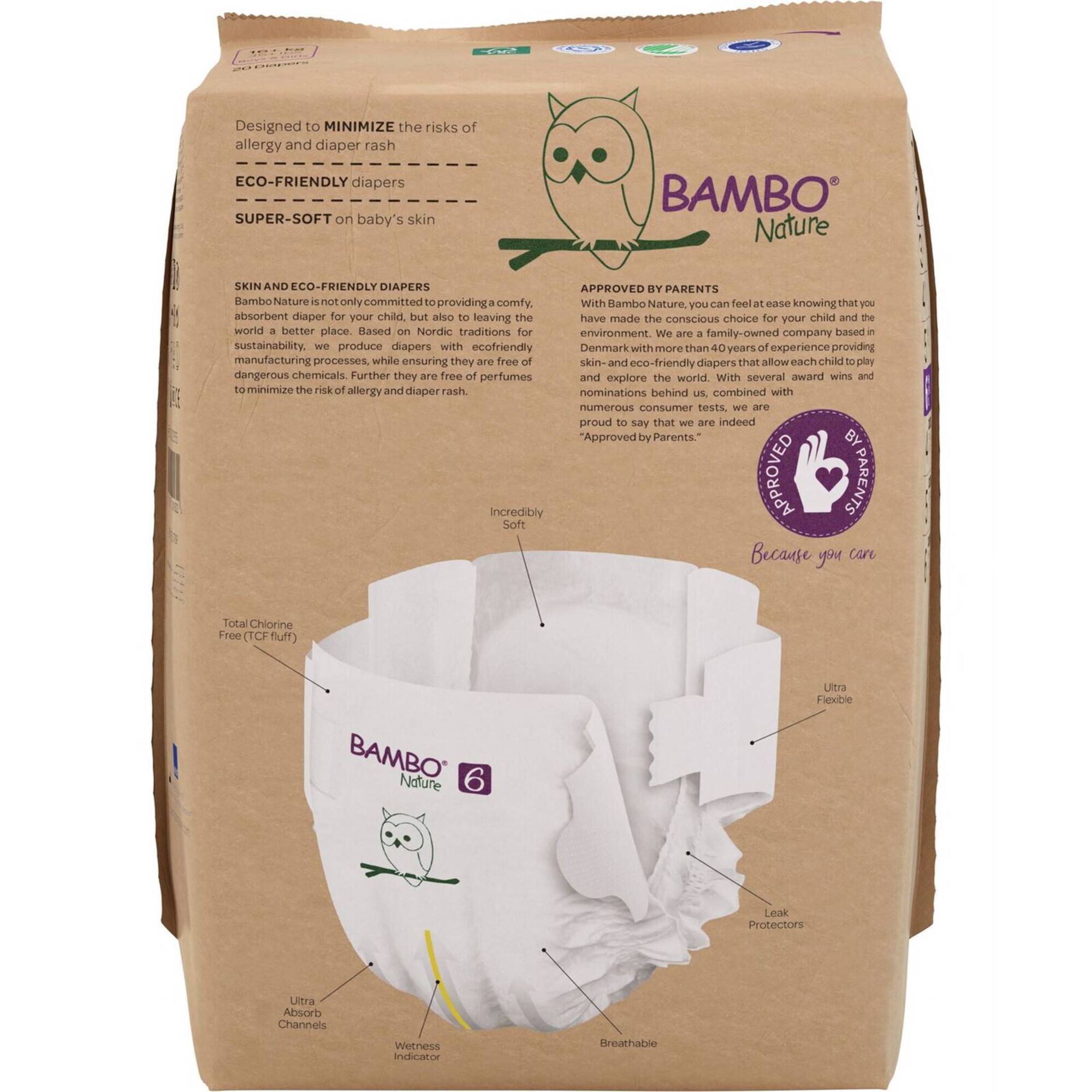 São superabsorventes, hipoalergénicas e dermatologicamente testadas. O pacote é feito de papel, sendo ainda mais sustentável.