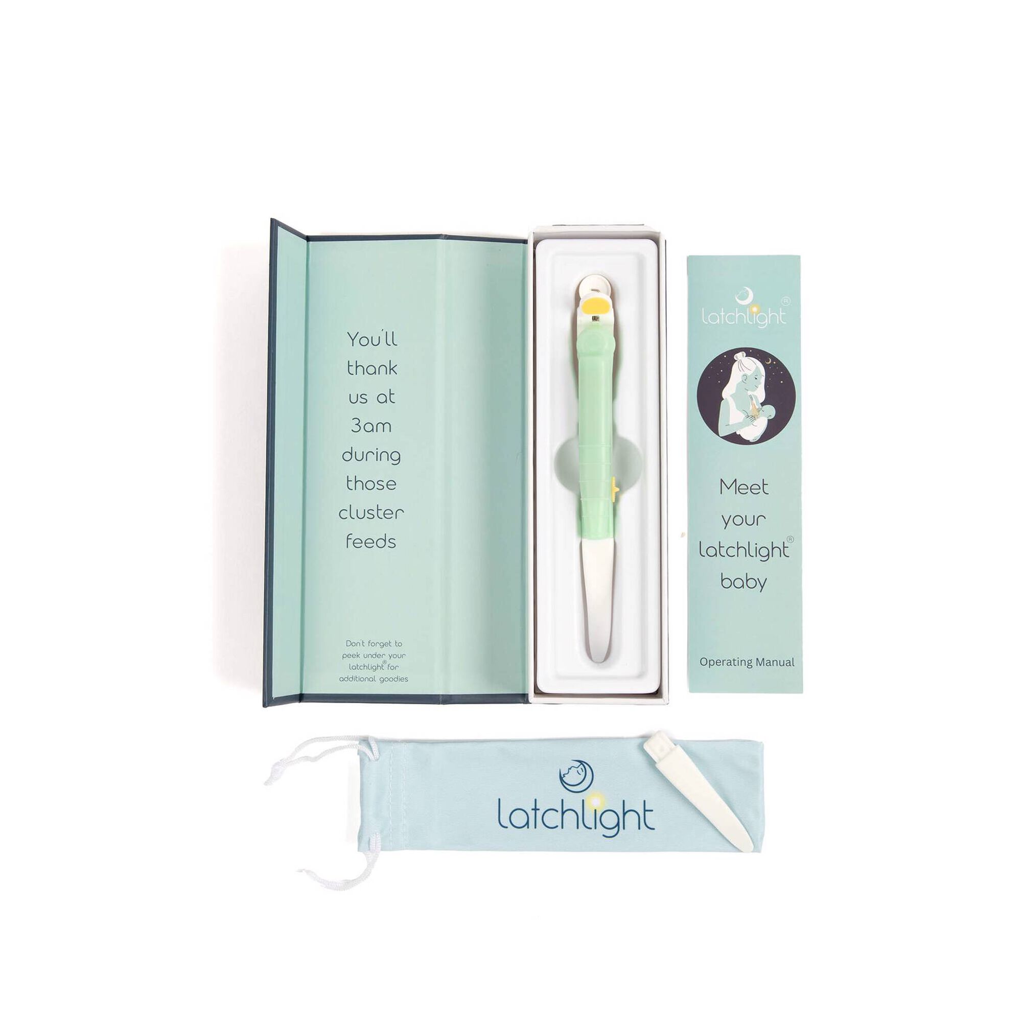 O LatchLight emite uma luz suave e direcionada que ilumina delicadamente a boca do bebé durante a amamentação ou alimentação com biberão, ajudando a garantir uma pega correta.