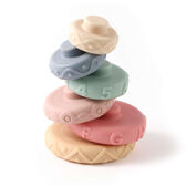 Brinquedo 100% em borracha, com cinco mordedores empilháveis que formam uma torre.