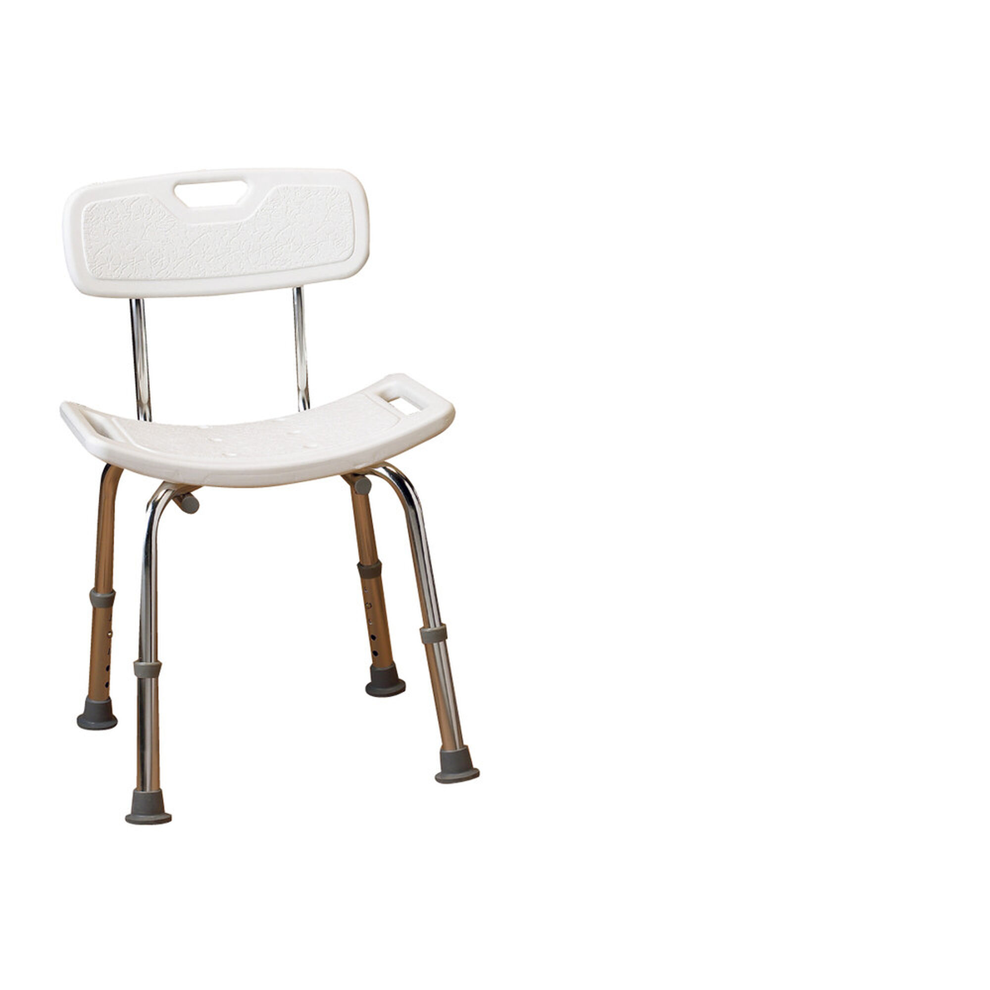 Cadeira em alumínio cromado. Regulável em altura 35-45 cm. Base com perfurações para saída de água.