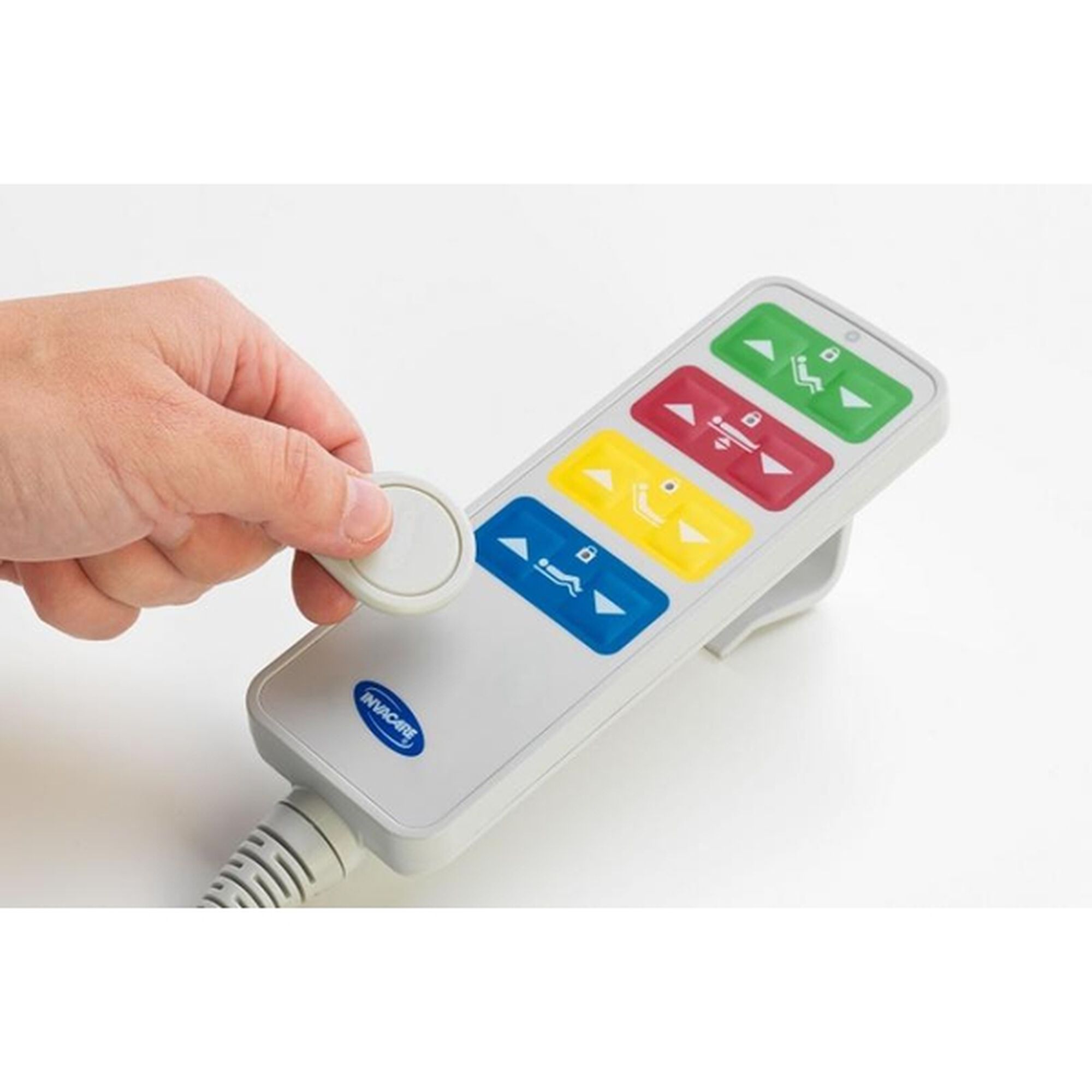 Comando com funções elétricas de elevação do estrado, regulação do encosto e articulação dos joelhos.
