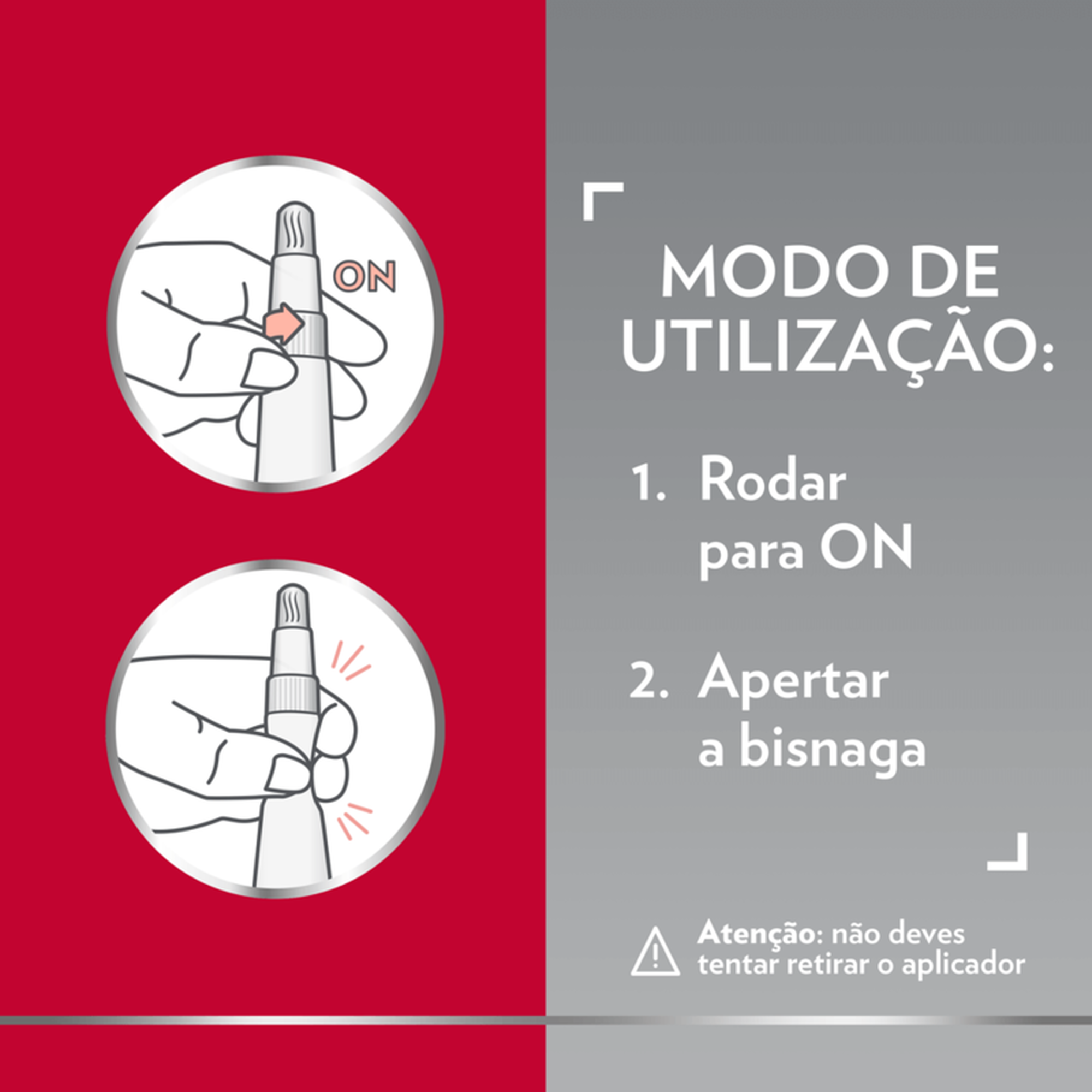 3 - Para abrir o tubo, vire a base do aplicador na direção ON.