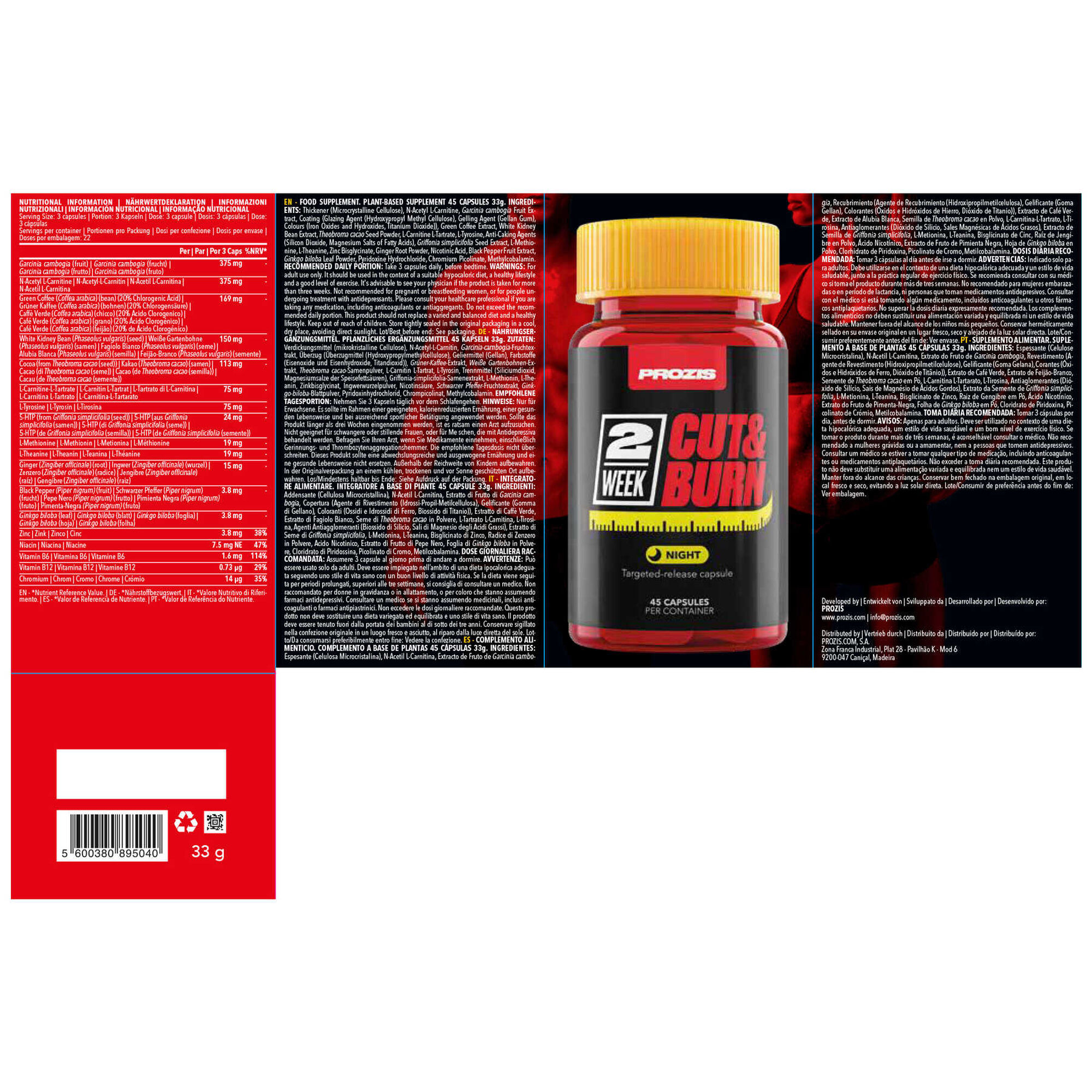 Espessante (Celulose microcristalina), N-Acetil L-Carnitina, Extrato do fruto de Garcinia cambogia, Revestimento (Agente de Revestimento (Hidroxipropilmetilcelulose), Gelificante (Goma Gelana), Corantes (Óxidos e hidróxidos de ferro, Dióxido de titânio)), Extrato de café verde, Extrato de Feijão-Branco, Semente de Theobroma cacao em Pó, L-Carnitina-L-Tartarato, L-Tirosina, Antiaglomerantes (Dióxido de Silício, Sais de magnésio de ácidos gordos), Extrato de Semente de Griffonia simplicifolia, L-Metionina, L-Teanina, Bisglicinato de zinco, Raiz de Gengibre em Pó, Ácido Nicotínico, Extrato do Fruto de Pimenta-Negra, Folha de Ginkgo biloba em Pó, Cloridrato de Piridoxina, Picolinato de crómio, Metilcobalamina.