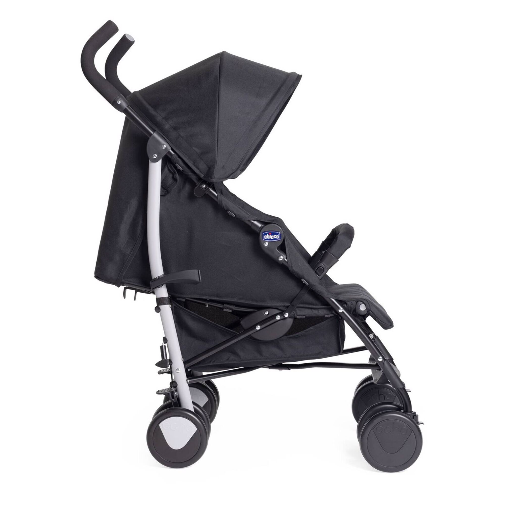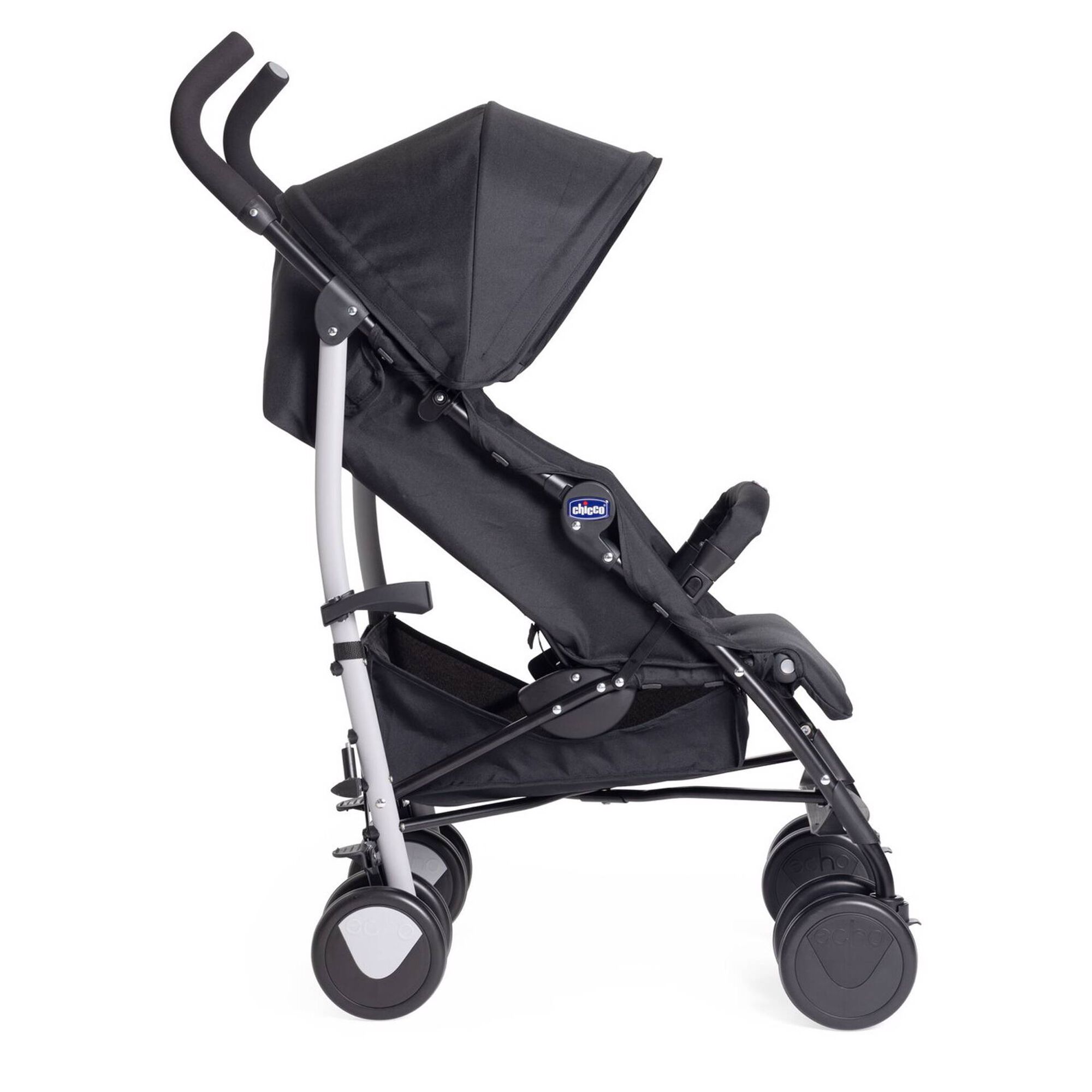 O carrinho Echo Lite é totalmente ajustável, oferecendo encosto reclinável em quatro posições e apoio de pernas regulável, para acompanhar cada fase do crescimento do bebé.
