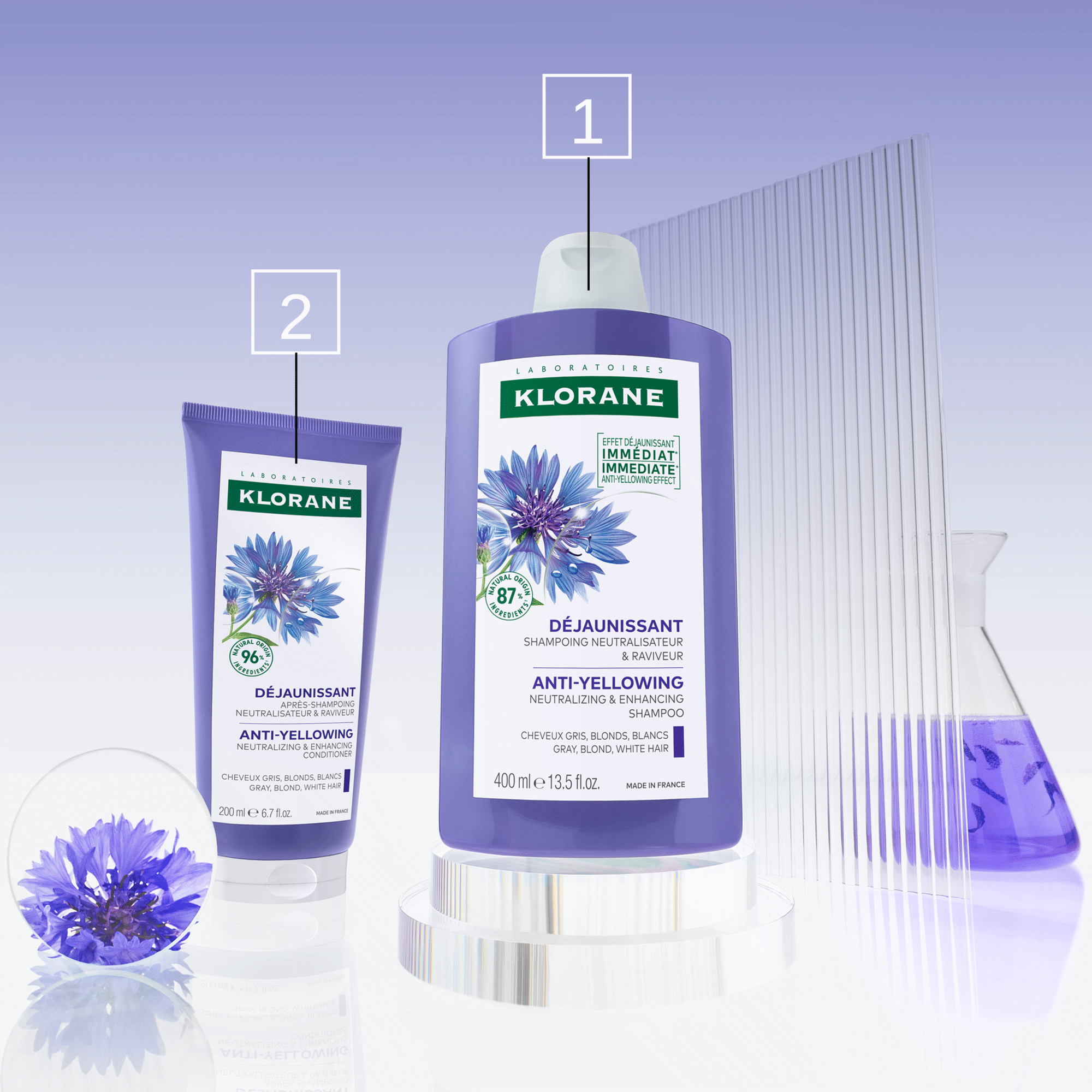 Condicionador com CENTAUREA BIO, este condicionador natural* de alta tolerância neutraliza os reflexos amarelos e acobreados do cabelo branco, grissalho e loiro platinado desde a primeira utilização.