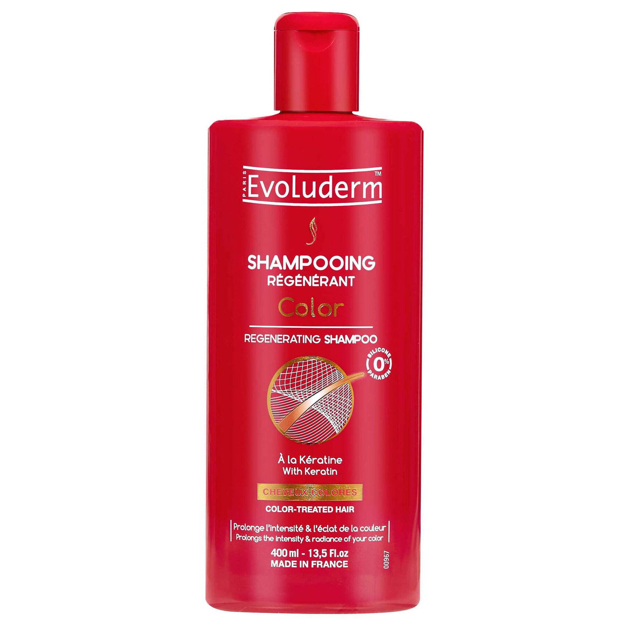 O champô para cabelo pintado regenerador Color da Evoluderm é enriquecido com queratina que ajuda a reparar as áreas enfraquecidas do cabelo e prolonga a intensidade da cor.