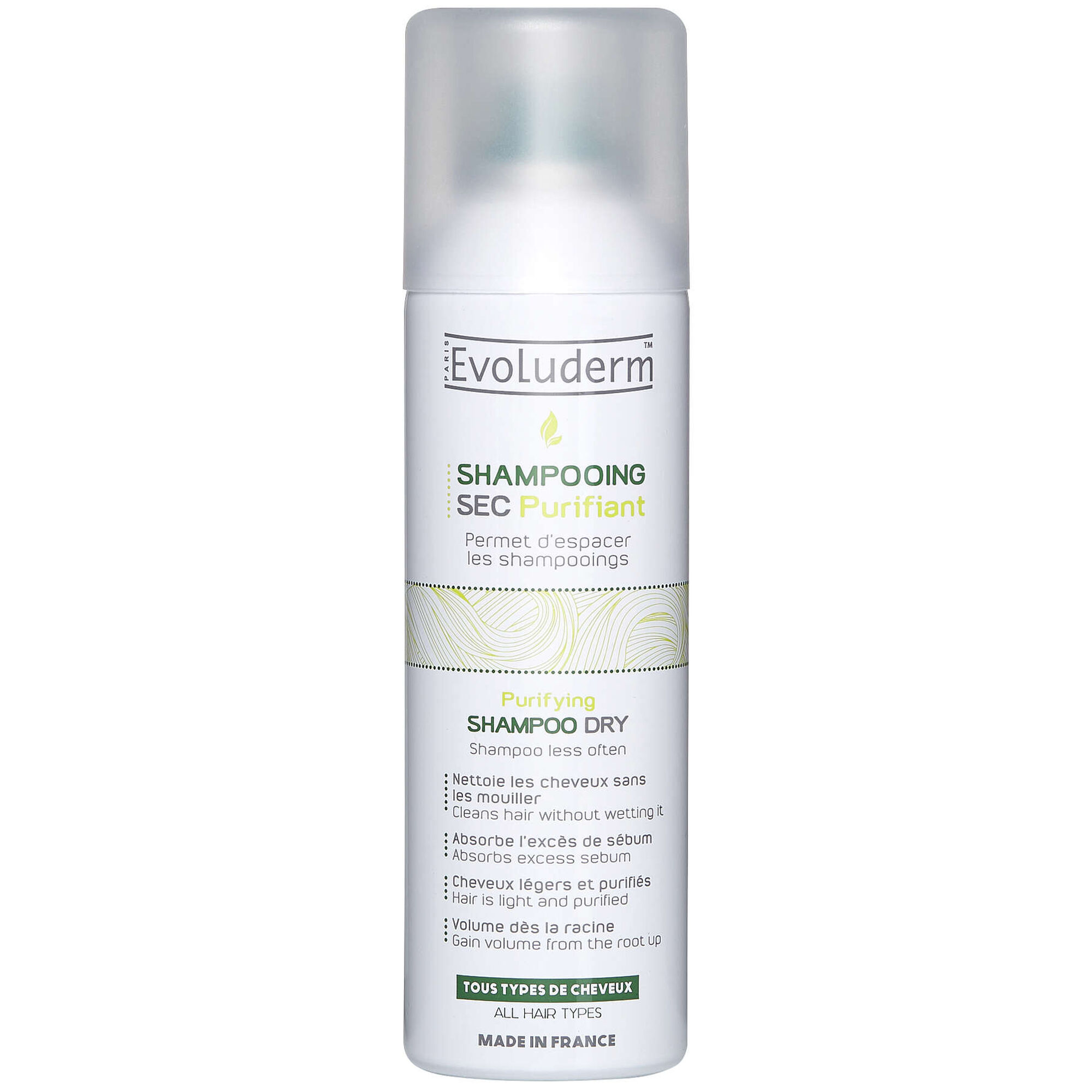 O champô seco purificante da Evoluderm limpa o cabelo sem ser necessário molhá-lo e absorve o excesso de sebo nas raízes.