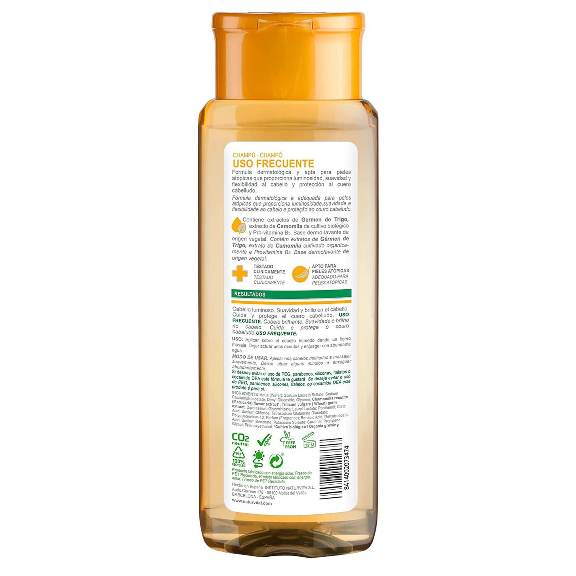 Champô dermatológico, de uso frequente e adequado para couro cabeludo sensível ou atópico. Proporciona luminosidade e suavidade ao cabelo, flexibilidade à fibra capilar e proteção ao couro cabeludo. Contém extratos de gérmen de Trigo que reestrutura a queratina capilar, extrato de Camomila de cultivo biológico para suavizar e cuidar do cabelo e provitamina B5 para nutrir em profundidade.