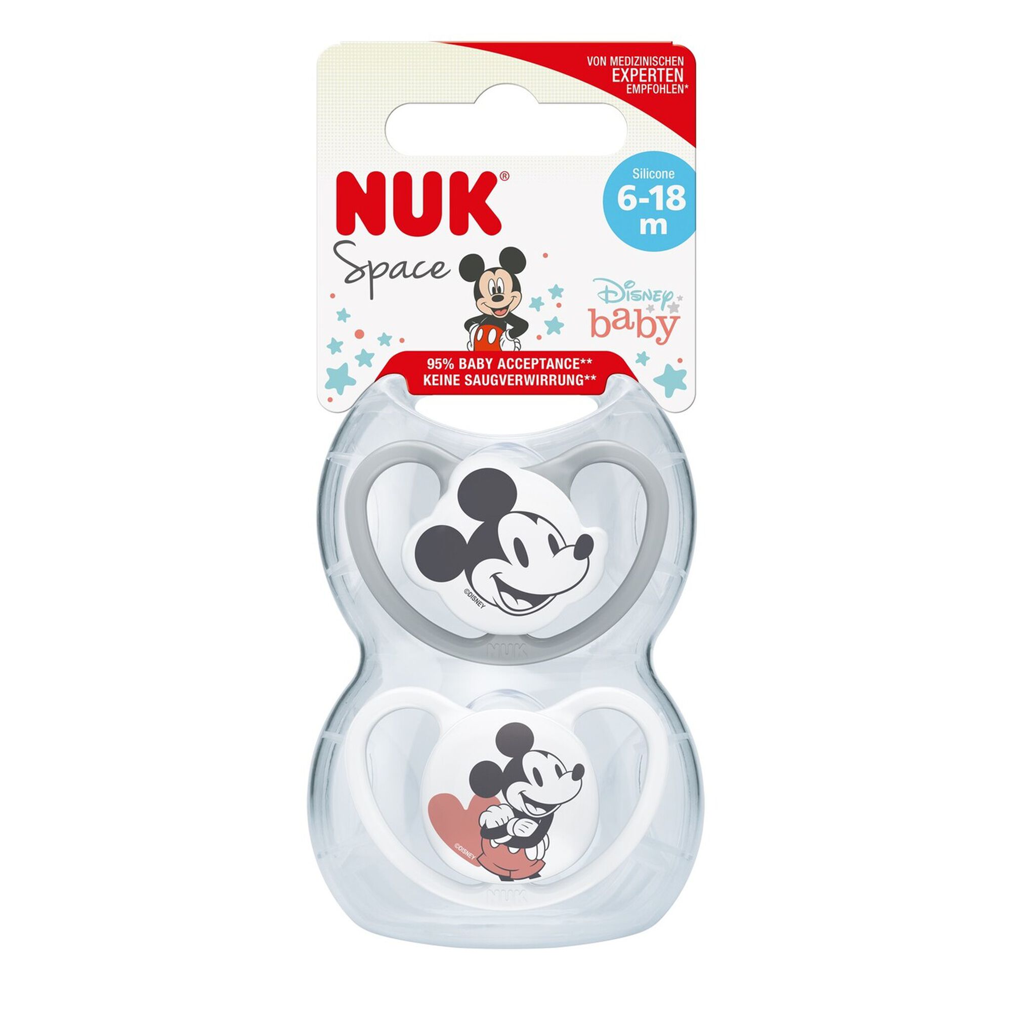 NUK Space Silicone especialmente concebida para bebés com pele sensível. Orifícios de ventilação extra-largos permitem o máximo de circulação de ar, deixando a pele respirar. Forma da tetina baseada no formato do mamilo da mãe enquanto amamenta, permitindo um encaixe perfeito na cavidade oral do bebé. Tamanho 6 - 18 meses. Com embalagem que permite a higienização da chupetas no micro-ondas bem como o transporte das mesmas.