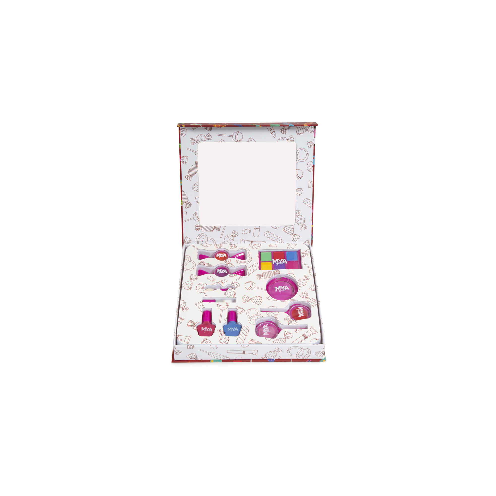 Kit de maquilhagem para crianças com doces, apresentado numa bonita caixa estampada com doces.