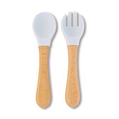O conjunto colher e garfo de silicone é o produto ideal para as primeiras refeições do seu bebé. Fabricado em materiais resisitentes e fáceis de limpar. Talheres com cabo ergonómico de madeira e extremidade em silicone macio.