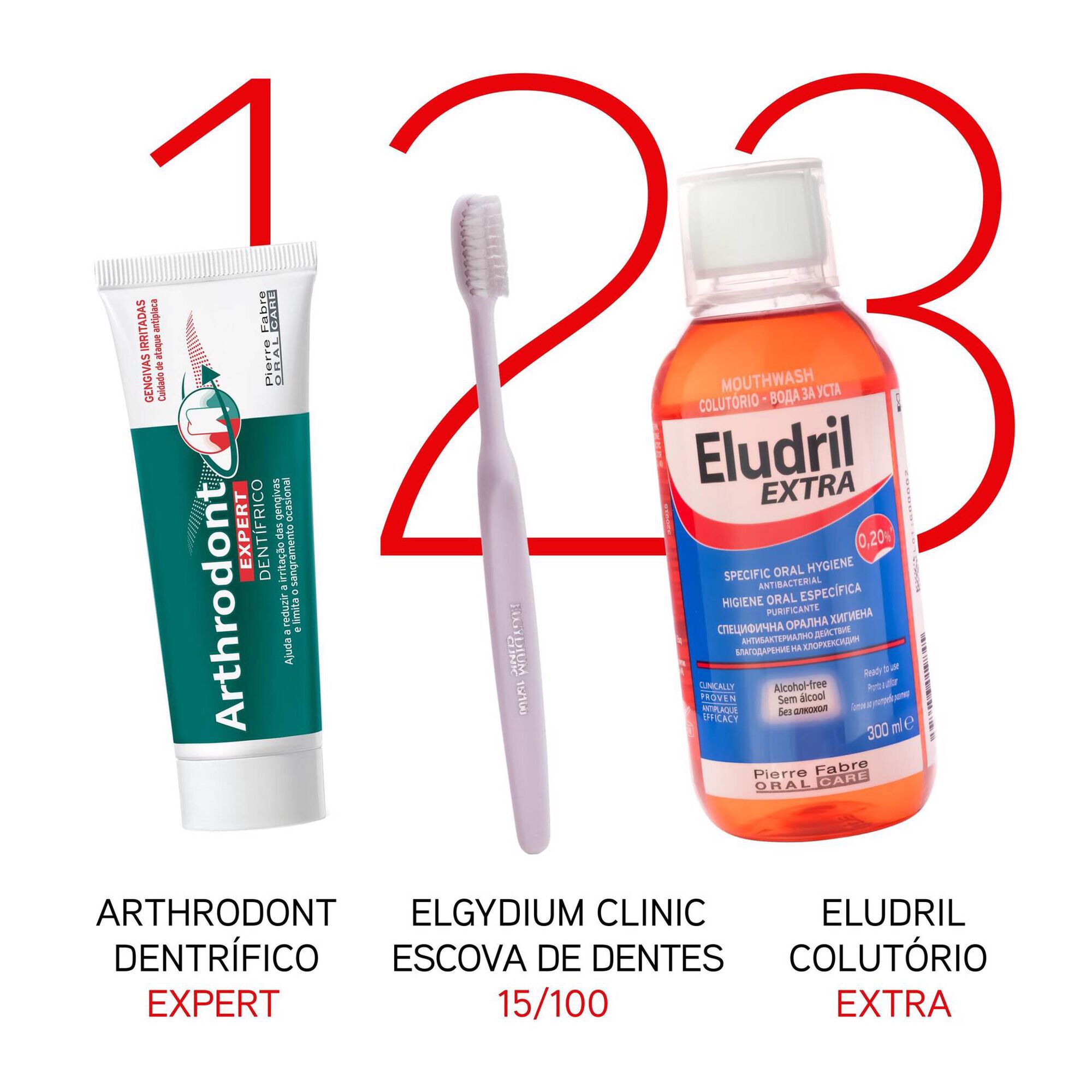 Colutório Eludril Extra ajuda a combater a formação da placa bacteriana e a prevenir o desenvolvimento ou agravamento dos problemas das gengivas, contribuindo para uma melhor saúde oral. Conta com uma concentração ótima de cloro-hexidina 0,20% e um efeito prolongado até 12 horas. Pode ser utilizado como complemento em tratamentos periodontais ou implantares.