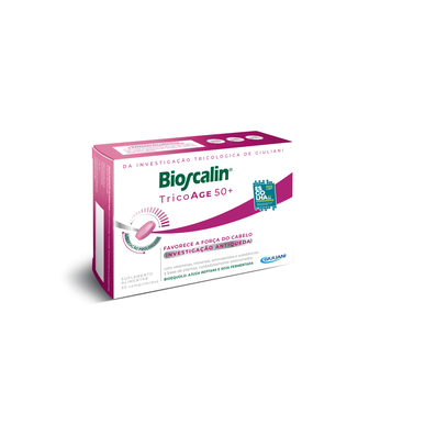 Suplementos alimentar Tricoage50+ com uma fórmula exclusiva que proporciona elementos essenciais ao bolbo capilar para um cabelo sem corpo e com tendência à queda.