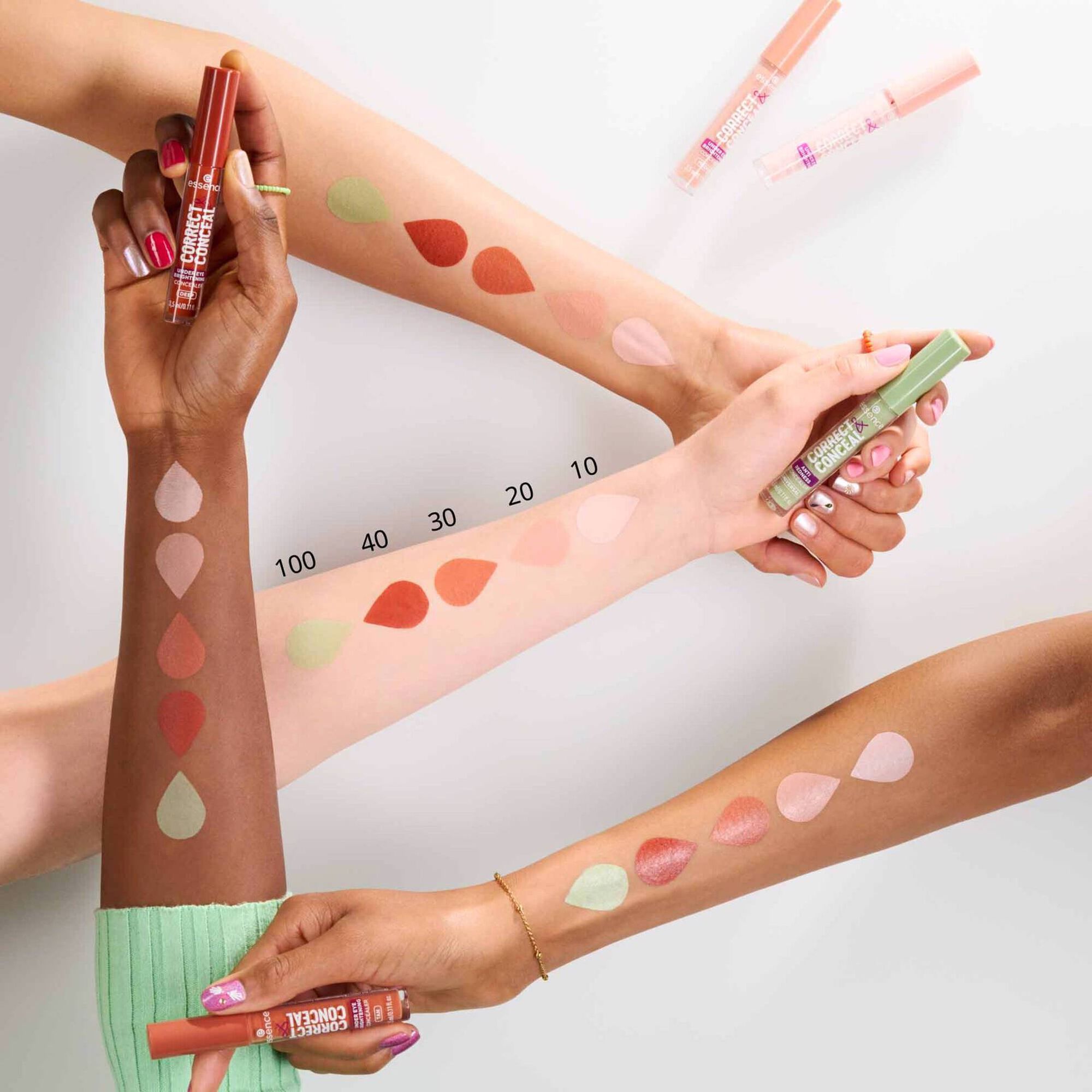 A textura com cobertura média a alta intensificável irá proporcionar-te um acabamento suave e natural. Para cobrir qualquer vermelhidão, aplica o corretor com o aplicador integrado e mistura com o dedo ou com o pincel corretor essence.